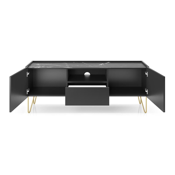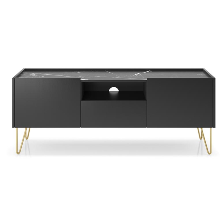 Gold-coloured, curved legs with a diameter of 10 mm and a height of 200 mm, which are powder-coated, add a sophisticated touch to the cabinet and make it a real interior decoration. This combination makes the Harmony RTV cabinet a perfect match for modern interiors, bringing a touch of luxury and style.