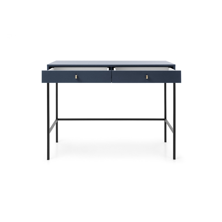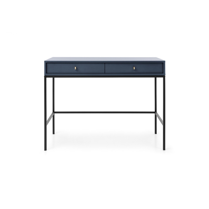 Mono MT104 is an extremely stylish and functional piece of furniture, which fits perfectly into modern design trends. The MONO collection in navy blue delights with its elegance and loft-like atmosphere. High, black legs give the furniture lightness, while minimalist handles in gold emphasise its modern character. The dressing table was designed with practicality and aesthetics in mind. It has two capacious drawers, which help to keep order and store necessary cosmetics or accessories. The SLIM collection makes the furniture ideal for smaller rooms while maintaining a stylish presence. The dressing table is only 50 cm deep, making it the perfect choice for a variety of spaces. The dressing table's dimensions are 103.5 cm wide, 77.6 cm high and 50 cm deep. Its body is made of durable 16 mm thick laminated board with ABS edging. The front of the dressing table, also made of laminated board, has elegant ABS edging and a metal handle, adding a unique character to the furniture. The metal frame on which the dressing table's legs rest adds stability and a modern look to the structure. The navy blue colour scheme will make the Mono MT104 dressing table a design accent in your space.