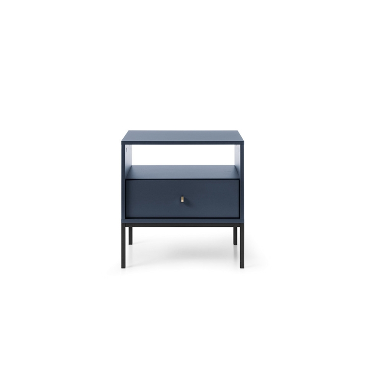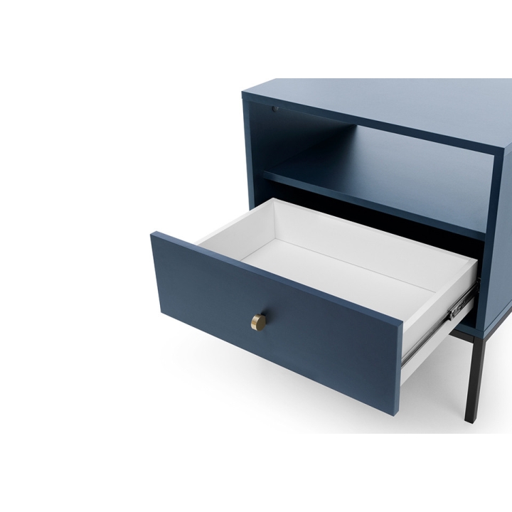 The MS54 Mono bedside cabinet is a designer piece of furniture from the MONO collection, characterised by modern design, elegance and subtle references to the loft climate. This cabinet is not only a practical element of the bedroom, but also a stylish accessory that fits in with current design trends. The MS54 Mono bedside cabinet has one drawer and a practical recess, making it the perfect place to store various trinkets while keeping the bedroom tidy. Its geometric form, high black legs and distinctive colour scheme emphasise the furniture's modern style. The minimalist gold-coloured handles give the cabinet additional charm, creating an elegant contrast with the rest of the furniture. Stability and a modern look are guaranteed by the 18×18 mm metal frame on which the cabinet's legs are placed. The dimensions of the bedside cabinet are 53.6 cm wide, 56.2 cm high and 39 cm deep. The body of the furniture is made of durable 16 mm thick laminated board with ABS edging. The front of the drawer is also made of laminated board, with elegant ABS edging and a metal handle, which gives the furniture a distinctive look. The MS54 Mono bedside cabinet is a harmonious combination of functionality, modern design and high quality workmanship that will bring a unique atmosphere to the bedroom.