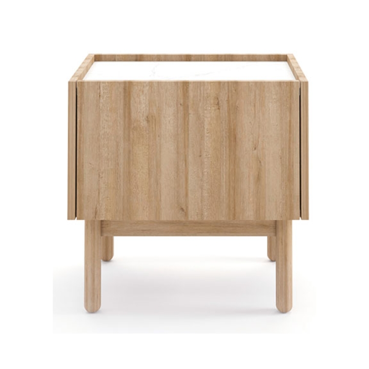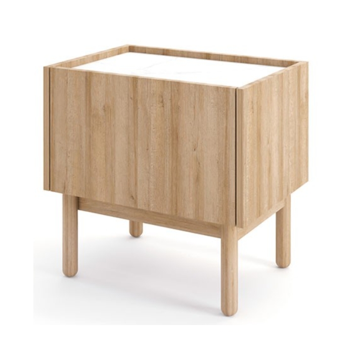 Imagine mornings when everything you need - a book, your phone, a cup of coffee - is right there on the solid 50 cm wide top. And how about evenings when the subtle light of the lamp reflects gently off the warm shade of Riviera Oak and marble accents? Sound good?