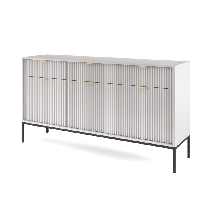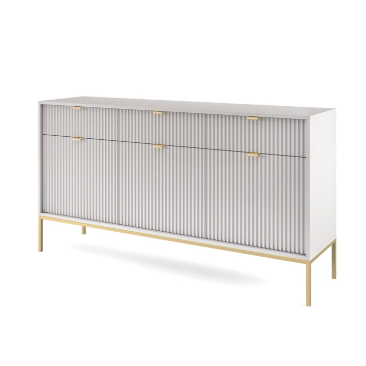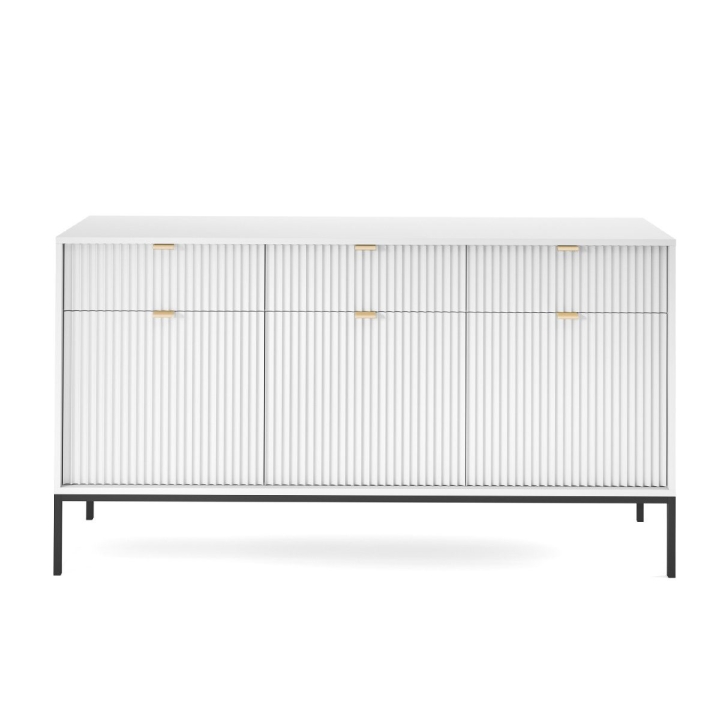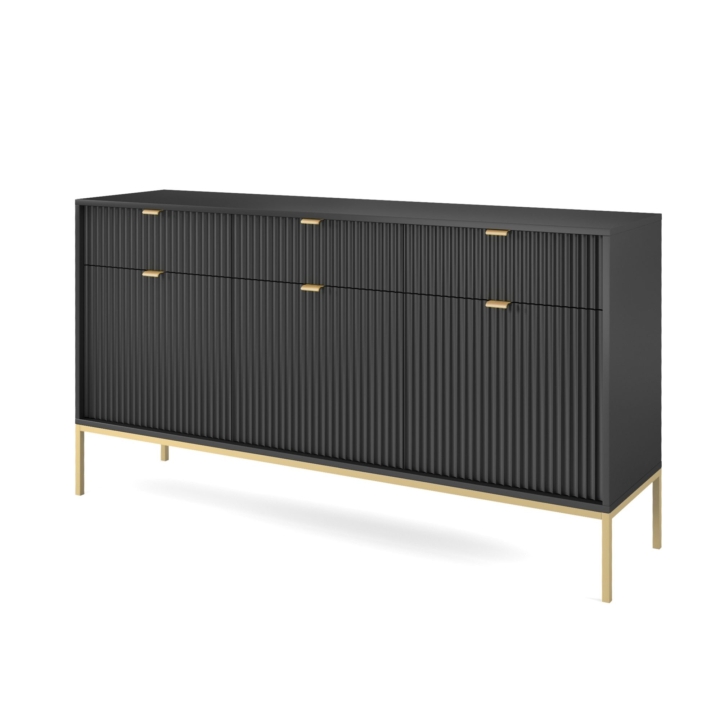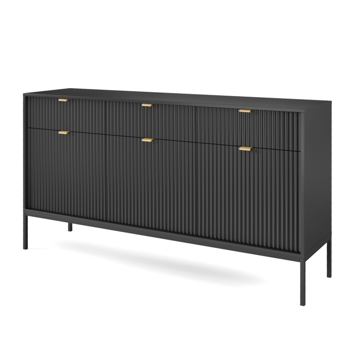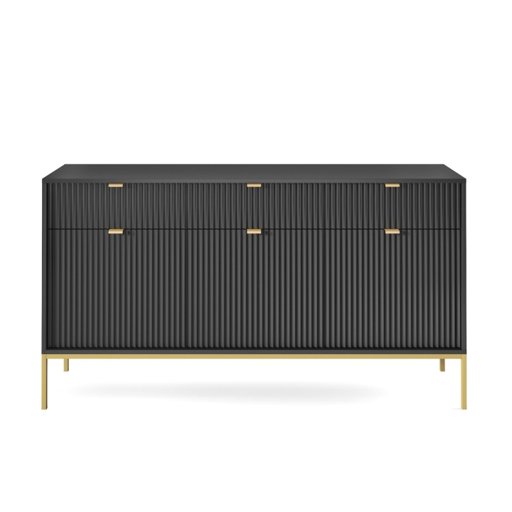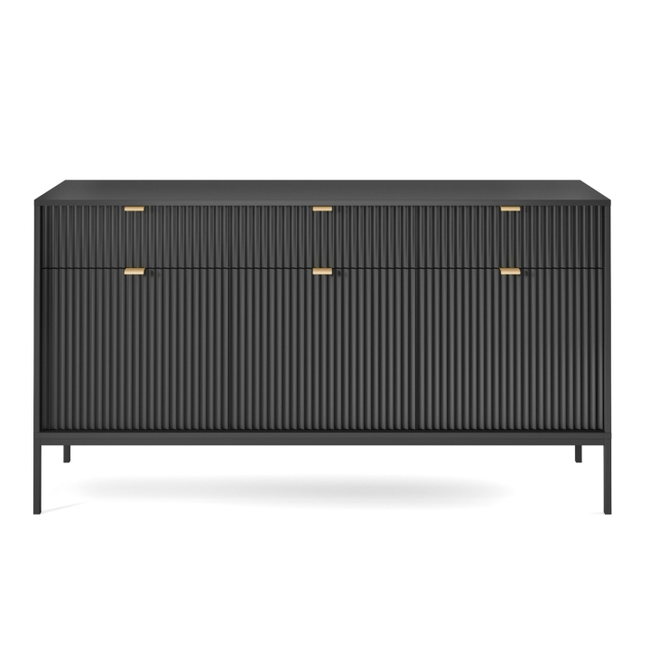 Are you dreaming of an impressive chest of drawers that not only holds lots of things, but also becomes the centrepiece of your interior? The Nova KSZ154 chest of drawers is the perfect choice. With a width of 154 cm, a height of 83 cm and a depth of 39 cm, this piece of furniture offers plenty of storage space while remaining elegant. The chest of drawers is made of sturdy 16 mm thick laminated board with 0.5 mm ABS edging, while the fronts are 18 mm thick fluted MDF with decorative ABS edging. An additional detail is the aluminium handle, giving the furniture a modern feel. Available in three colour options - black, white and grey. Each of these variants can be fitted with legs of the colour of your choice, i.e. black or gold. In this way, you can customise the chest of drawers to suit your unique style and preferences. The leg frame, made of powder-coated steel with an 18 mm profile, ensures stability and durability. The Nova KSZ154 chest of drawers is not only a practical storage solution, but also a design element that will emphasise the character of your interior.