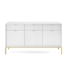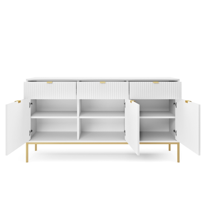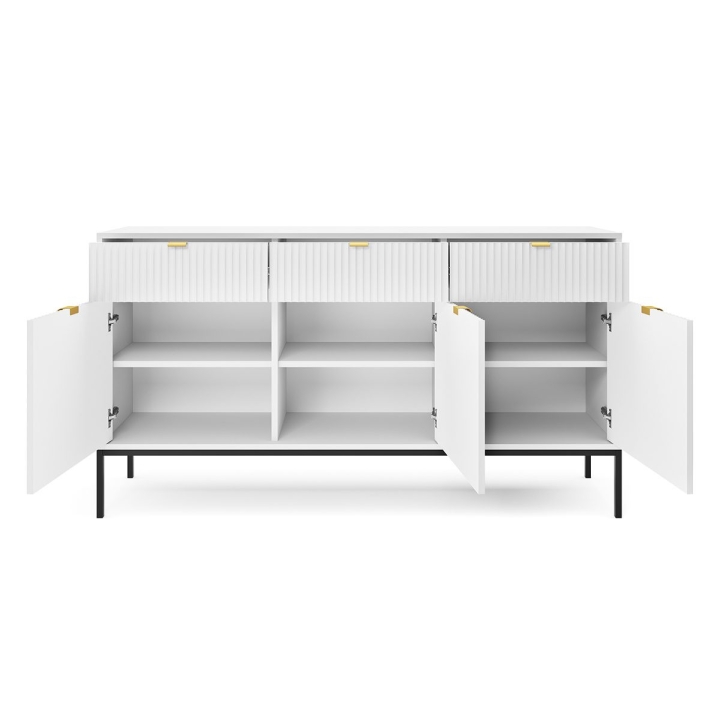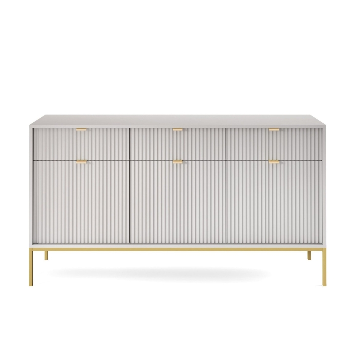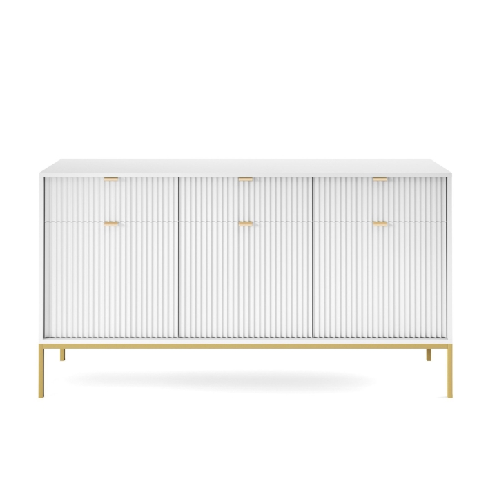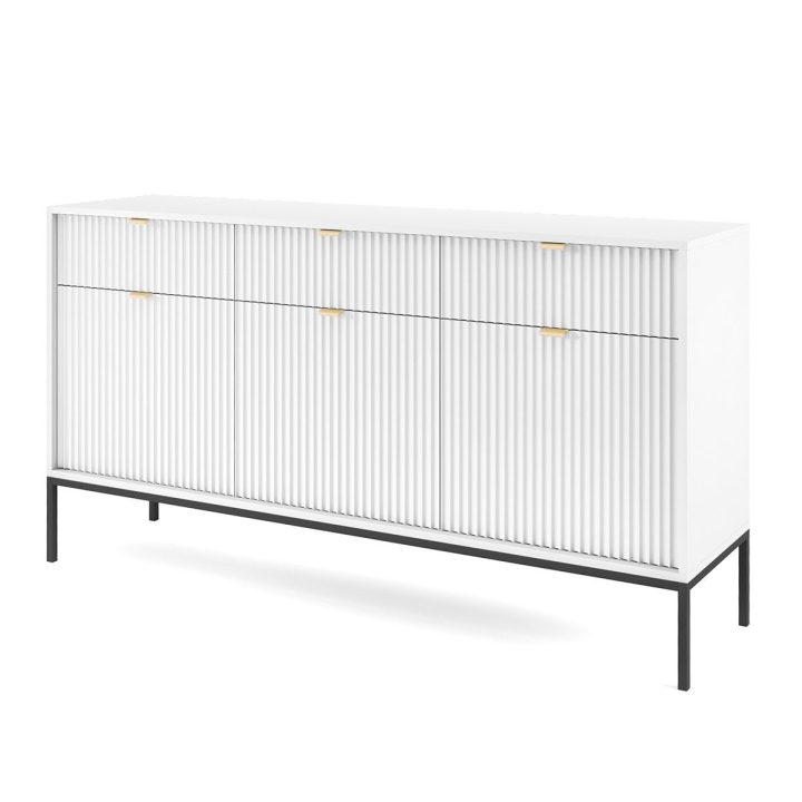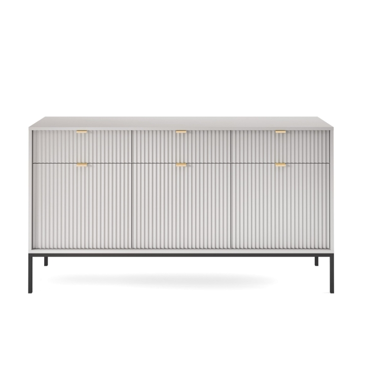 Are you dreaming of an impressive chest of drawers that not only holds lots of things, but also becomes the centrepiece of your interior? The Nova KSZ154 chest of drawers is the perfect choice. With a width of 154 cm, a height of 83 cm and a depth of 39 cm, this piece of furniture offers plenty of storage space while remaining elegant. The chest of drawers is made of sturdy 16 mm thick laminated board with 0.5 mm ABS edging, while the fronts are 18 mm thick fluted MDF with decorative ABS edging. An additional detail is the aluminium handle, giving the furniture a modern feel. Available in three colour options - black, white and grey. Each of these variants can be fitted with legs of the colour of your choice, i.e. black or gold. In this way, you can customise the chest of drawers to suit your unique style and preferences. The leg frame, made of powder-coated steel with an 18 mm profile, ensures stability and durability. The Nova KSZ154 chest of drawers is not only a practical storage solution, but also a design element that will emphasise the character of your interior.