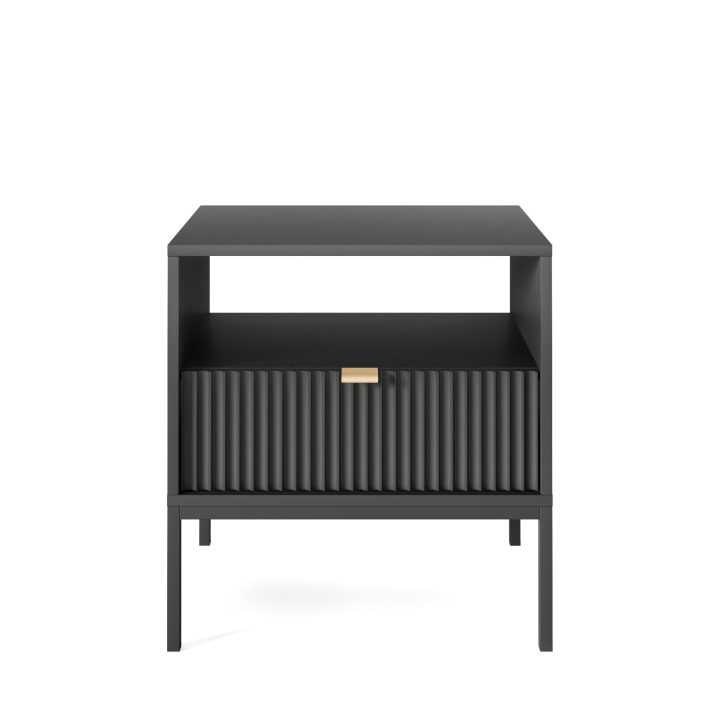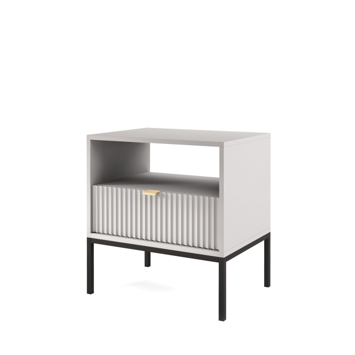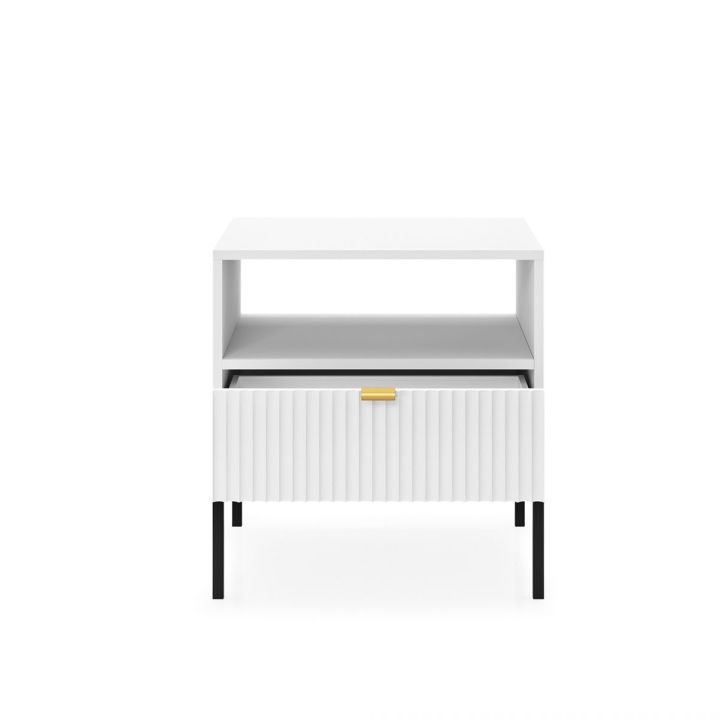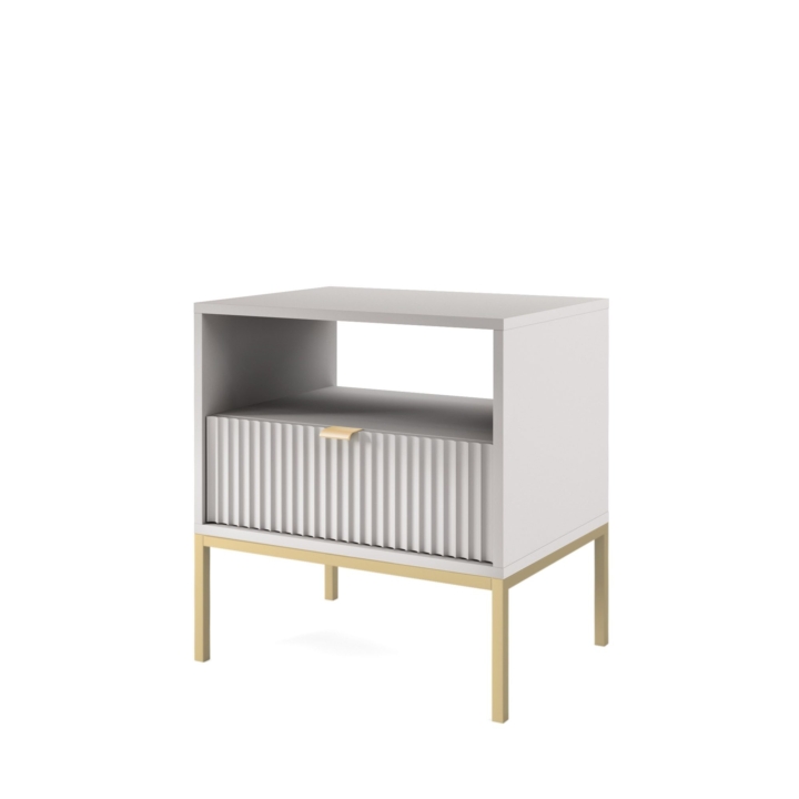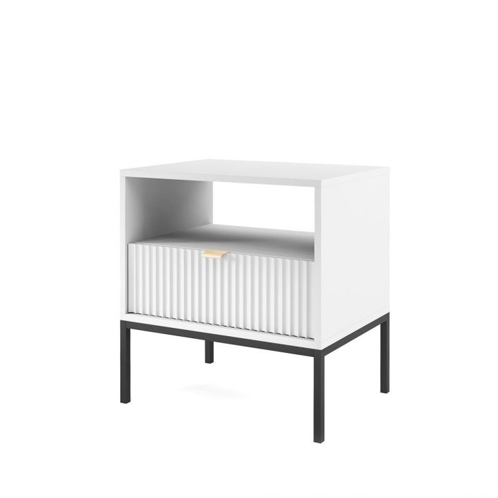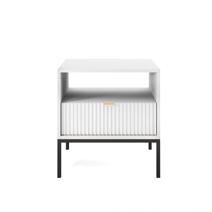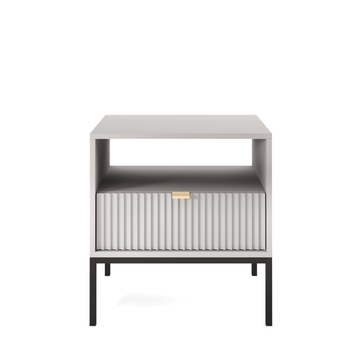 Are you looking for a stylish bedside cabinet to complement your bedroom decor? The Nova S54 Nightstand is the perfect solution, combining modern design with practical use. With dimensions of 54x56x39 cm, this cabinet will work perfectly as a bedside table while offering storage space for your most important trinkets. The body of the cabinet is made of sturdy 16 mm thick laminated board with 0.5 mm ABS edging, while the fronts are made of 18 mm thick fluted MDF with decorative ABS edging. The aluminium handle gives the furniture a modern feel, while the leg frame, made of powder-coated steel with an 18 mm profile, ensures stability and durability. The Nova S54 Nightstand is available in three colour options - black, white and grey. In addition, the option to choose the colour of the leg frame, i.e. black or gold, allows you to customise the cabinet to your individual tastes, creating a harmonious accent in your bedroom arrangement. Functionality, aesthetics and solid workmanship make the Nova S54 Nightstand not only a practical piece of furniture, but also a design accessory that will bring elegance and style to your bedroom.