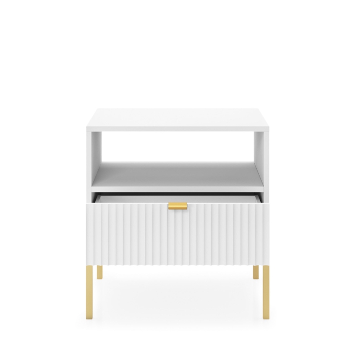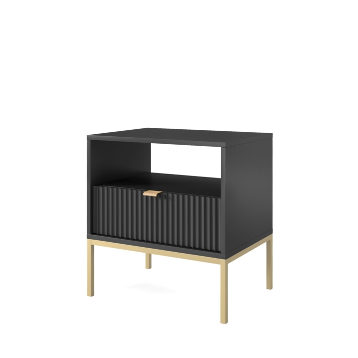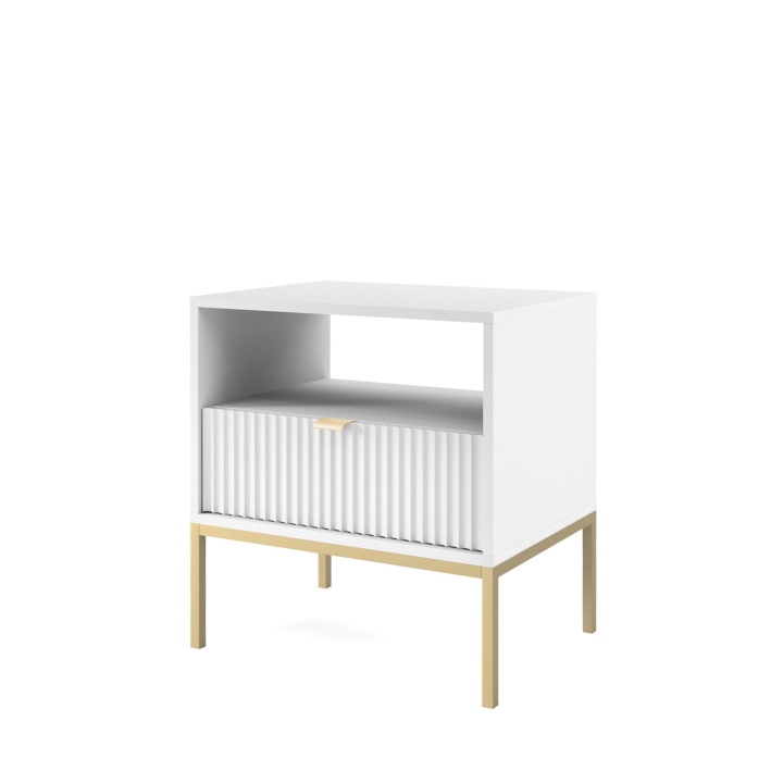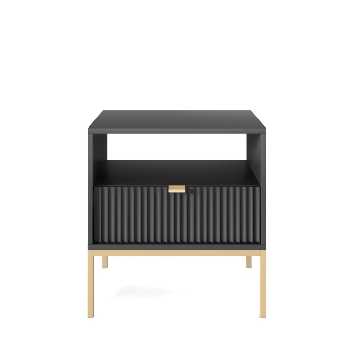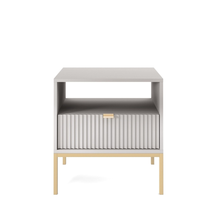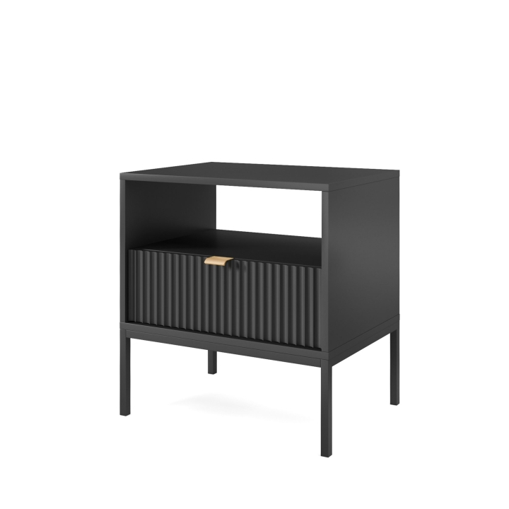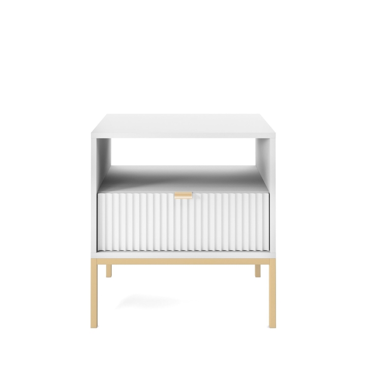 Are you looking for a stylish bedside cabinet to complement your bedroom decor? The Nova S54 Nightstand is the perfect solution, combining modern design with practical use. With dimensions of 54x56x39 cm, this cabinet will work perfectly as a bedside table while offering storage space for your most important trinkets. The body of the cabinet is made of sturdy 16 mm thick laminated board with 0.5 mm ABS edging, while the fronts are made of 18 mm thick fluted MDF with decorative ABS edging. The aluminium handle gives the furniture a modern feel, while the leg frame, made of powder-coated steel with an 18 mm profile, ensures stability and durability. The Nova S54 Nightstand is available in three colour options - black, white and grey. In addition, the option to choose the colour of the leg frame, i.e. black or gold, allows you to customise the cabinet to your individual tastes, creating a harmonious accent in your bedroom arrangement. Functionality, aesthetics and solid workmanship make the Nova S54 Nightstand not only a practical piece of furniture, but also a design accessory that will bring elegance and style to your bedroom.