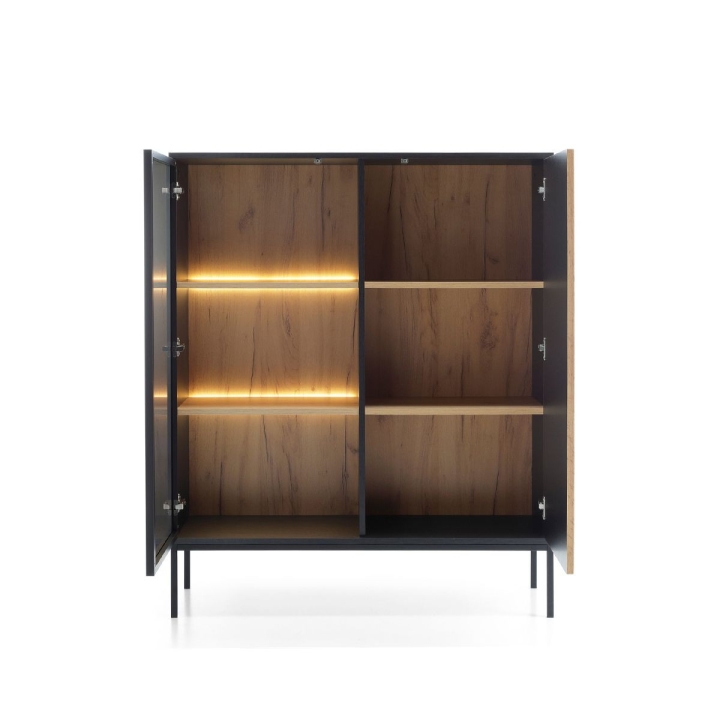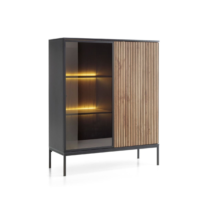 The Sento WT104 showcase is an elegant addition to your interior design. Its exceptional character is determined not only by its compact size (104 cm wide, 166 cm high, 39 cm deep), but also by its careful workmanship. Its solid body made of laminated board (16 mm) in the shade of Wotan Oak is not only durable but also aesthetically pleasing. The mdf front (18 mm), stained and impressively milled, gives the display a unique charm. The glazed door made of black-tinted toughened antisol glass (4 mm), set in an aluminium frame (18 mm), gives the furniture lightness and elegance. The stylish legs, made of steel profile (18 x 18 mm) and powder-coated in black, not only stabilise the structure, but also add a modern touch. It is not only a practical storage space, but also a design element that will blend into any interior, giving it a unique style. Are you ready for a functional and elegant display cabinet that will emphasise the unique character of your room?