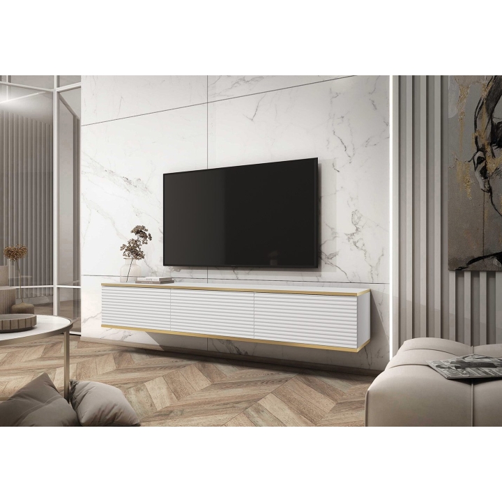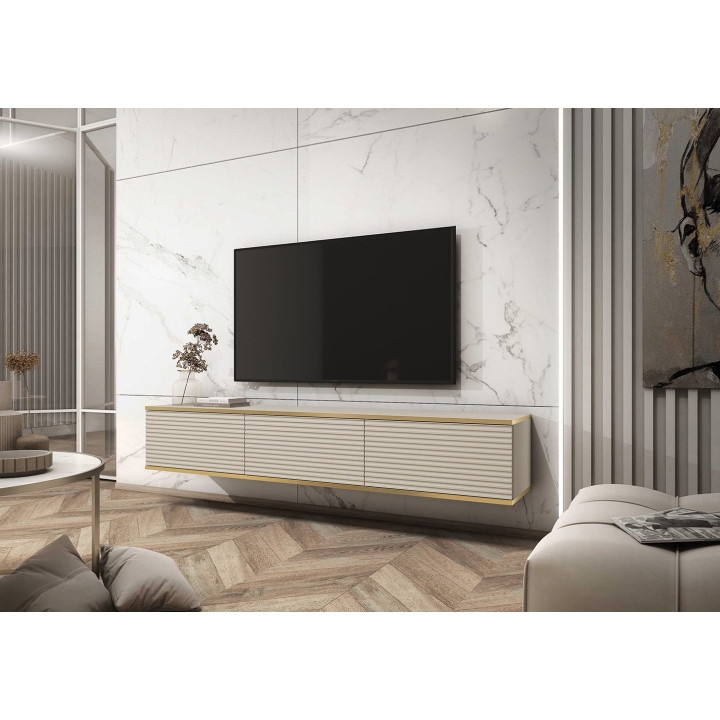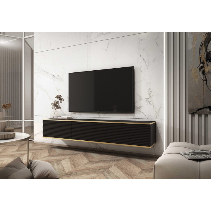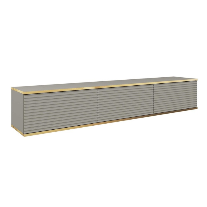 The Oro MDF wall-mounted RTV cabinet is not only practical but also a stylish solution for your living room, available in a diverse colour palette: black, white, beige, grey. With it, you can tailor your choice to your individual tastes. Here are the key product details (175 cm wide, 30 cm high, 32 cm deep). The solid body, made of 16 mm thick laminated board and protected with 0.5 mm ABS edging, guarantees durability and aesthetically pleasing workmanship. The front of the cabinet, also made of 16 mm thick laminated board with 0.5 mm ABS edging, is maintained in a uniform and elegant design. In addition, the Oro MDF RTV cabinet has three practical drawers, making it not only a design element, but also a functional storage space. It is the ideal solution for your RTV equipment and other small items you want to keep close at hand at all times. Available in a variety of colours, you can adapt the cabinet to the character and style of your interior. Ready for functionality, elegance and choice?
