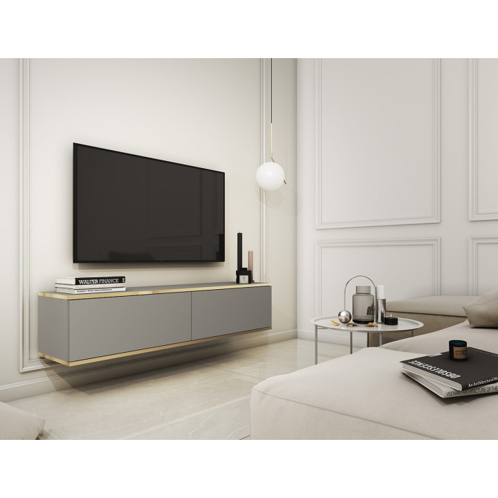 The Oro wall mounted RTV-135 cabinet with two drawers is the perfect combination of functionality and modern design that will bring a fresh look to your living room. Available in a variety of colours, including elegant grey, this RTV cabinet from manufacturer Piaski Furniture is for those who appreciate both modernity and timeless style. The innovative design of the cabinet, with a simple geometric shape that perfectly harmonises with the minimalist style of ORO furniture, gives your interior a unique character. The handleless opening system and horizontal fins on the door are details that make this RTV cabinet stand out from the rest. The dimensions of the cabinet (135 cm wide, 30 cm high, 32 cm deep) make it fit perfectly into various living room arrangements. Made of high-quality materials such as laminated furniture board and MDF, the cabinet is scratch- and stain-resistant. Special ABS edging protects it from damage, which guarantees the increased durability of the furniture. Available in four fashionable colour versions, you can adapt the Oro RTV cabinet to the character of your interior. Ready for modern elegance and functionality in one?