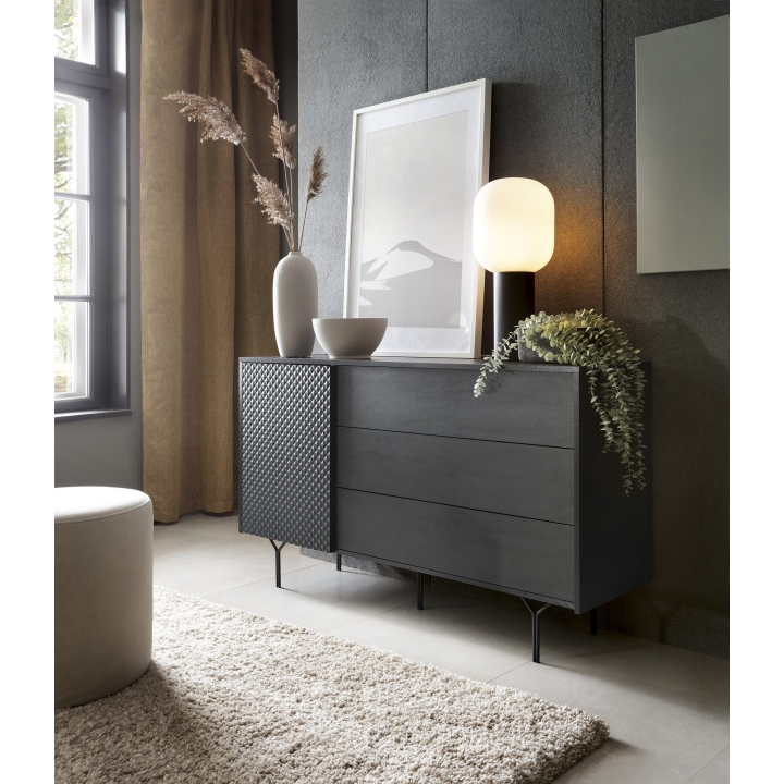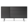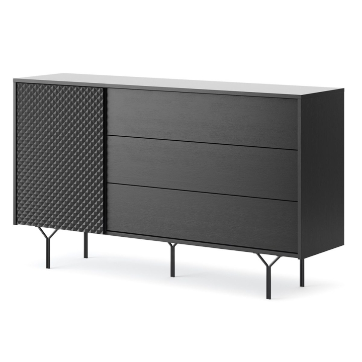Are you looking for an elegant chest of drawers that combines functionality and modern design? Here is the Raven KSZ144 chest of drawers in a unique black/black graphite colour scheme. It is a piece of furniture that will not only be perfect for storage, but will also become a design accent in your interior. Measuring 144x83x38 cm, the chest of drawers is the perfect solution for those who appreciate aesthetic details. The solid body made of 16 mm thick laminated board with 0.5 mm ABS edging guarantees the durability and stability of the furniture. The front of the chest of drawers is made of 18 mm thick MDF, milled, giving the furniture a modern character. One door and three drawers are a practical solution for storing a variety of items. Drawers made of 16 mm laminated board with 0.5 mm ABS edging are not only functional but also aesthetically pleasing. The legs made of bent and black-painted steel bar (10 x 20 mm) add lightness to the chest of drawers while emphasising its modern character. The Raven KSZ144 chest of drawers is not only a practical storage solution, but also a design element that will bring modern style to your interior. Invest in functionality and aesthetics - choose the Raven KSZ144 Chest of Drawers to create a unique atmosphere in your home.