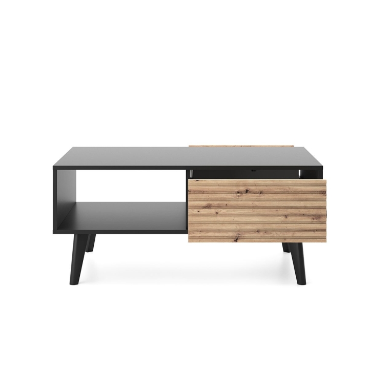 The Willow L104 bench is the perfect addition to your living room, combining elegance with practical use of space. Constructed from laminated board and MDF, reinforced with ABS edging, and with black wooden legs, this bench exudes modern style. Decorative fluted fronts in artisan oak add to the furniture's unique charm. The coffee table offers two capacious drawers and a practical shelf under the top, allowing you to store various items such as remote controls or newspapers. Thanks to the modern push to open system, opening and closing the drawers becomes easy and convenient. The dimensions of the Willow coffee table are 104 cm wide, 46 cm high and 68 cm deep. The 20 cm high metal leg gives the furniture a light and modern feel.