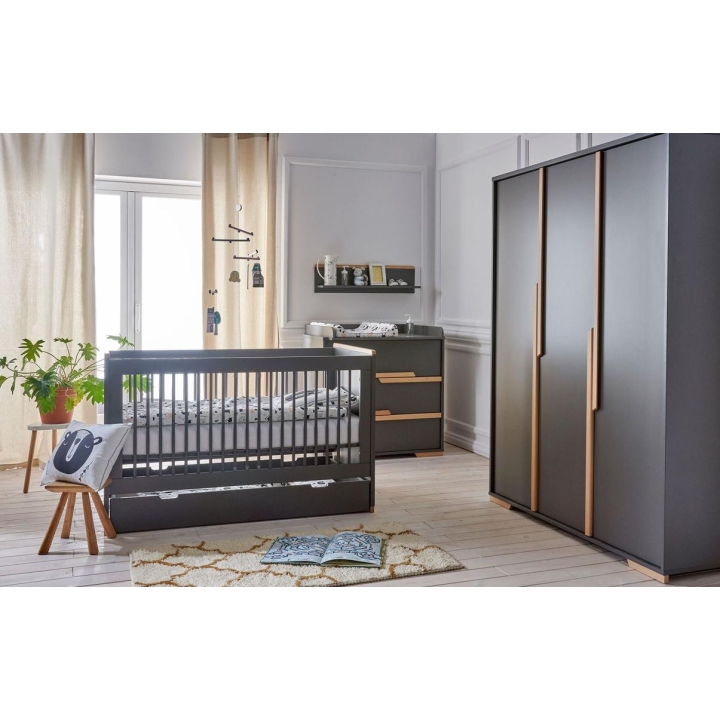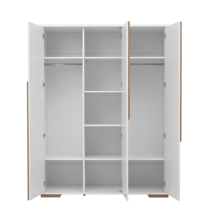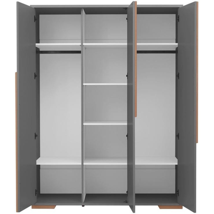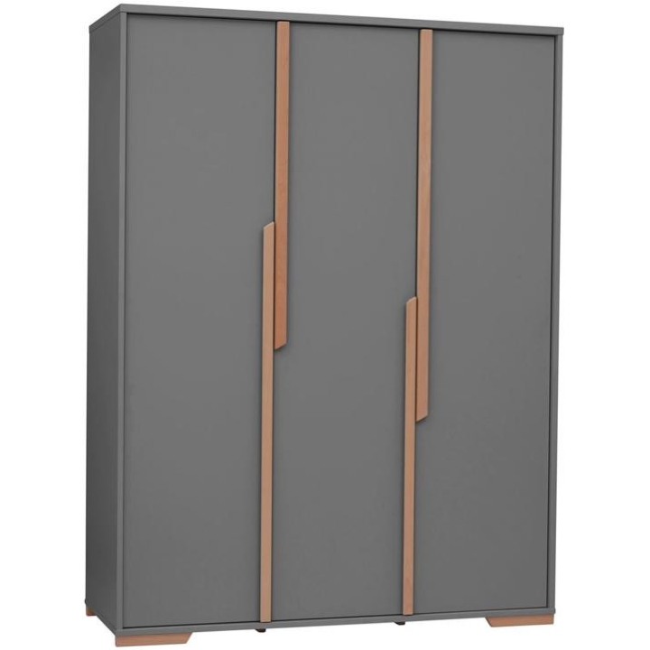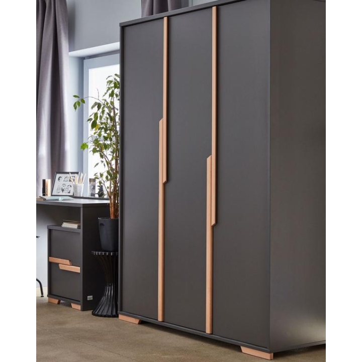 The three-door wardrobe from the Snap collection is a piece of furniture with an elegant design equipped with an advanced silent closing system. The interior of the wardrobe, measuring 146 cm in length, 195 cm in height and 56 cm in depth, provides plenty of storage space thanks to six shelves and two rods for hanging clothes. In addition, it is possible to purchase shelves - up to a maximum of four. The wardrobe has been designed with ease of assembly in mind, and the central door can be fitted left or right, depending on your preference. The wardrobe is made of painted MDF, laminated board (body, interior elements) and beech wood (wood-coloured elements). Care for the health of the users has been confirmed through the use of certified paints. The Snap wardrobe combines functionality with exceptional style, which is emphasised by the wooden handles and the aforementioned wooden beech legs. This elegant collection is available in two colours: white and dark grey.