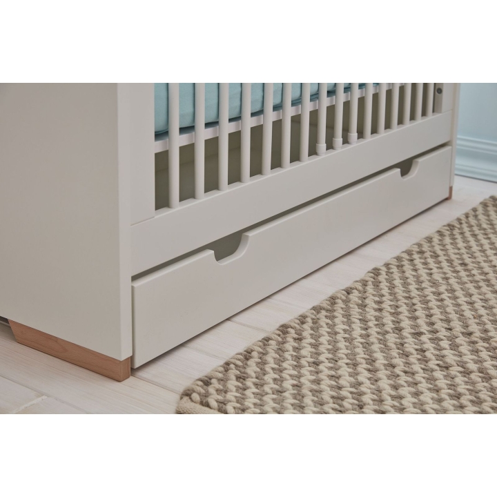 The drawer from the Snap collection is an accessory that provides additional usability to a cot from the same collection. Its dimensions - 139 cm deep, 18 cm high and 74 cm wide - provide additional storage space for bedding, blankets or clothes, for example. The drawer has been designed with ease of assembly in mind, and the water-based paints used during production are eco-friendly and safe for users. The accessory is made of MDF (fronts) and furniture board (sides and bottom), making it extremely durable. The Snap drawer is an extremely functional accessory, which is highlighted by the castors fitted in it, which make its pull-out simple and quiet. This elegant collection is available in two colours: white and dark grey.