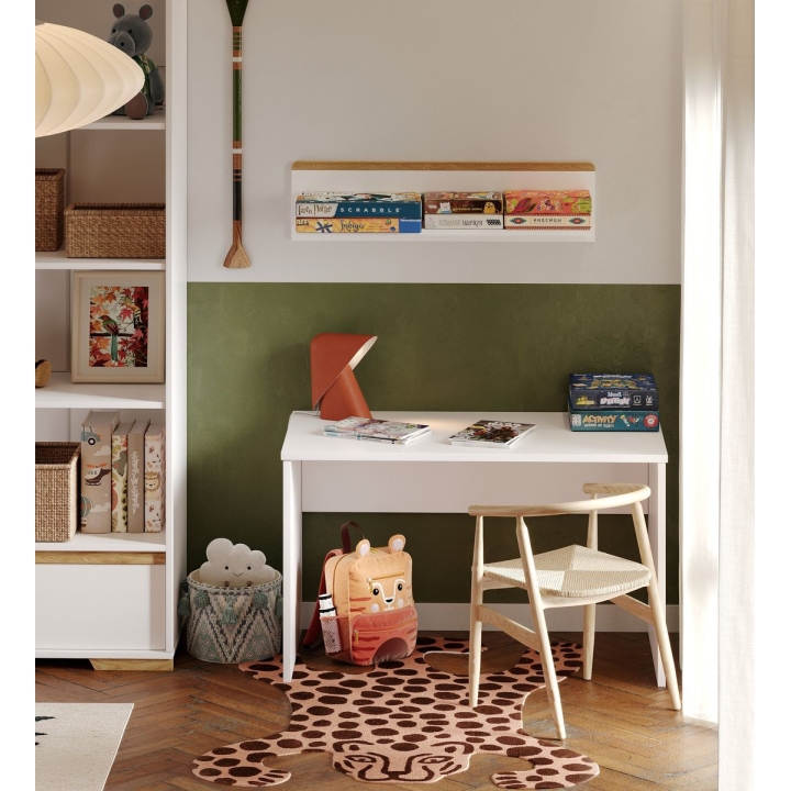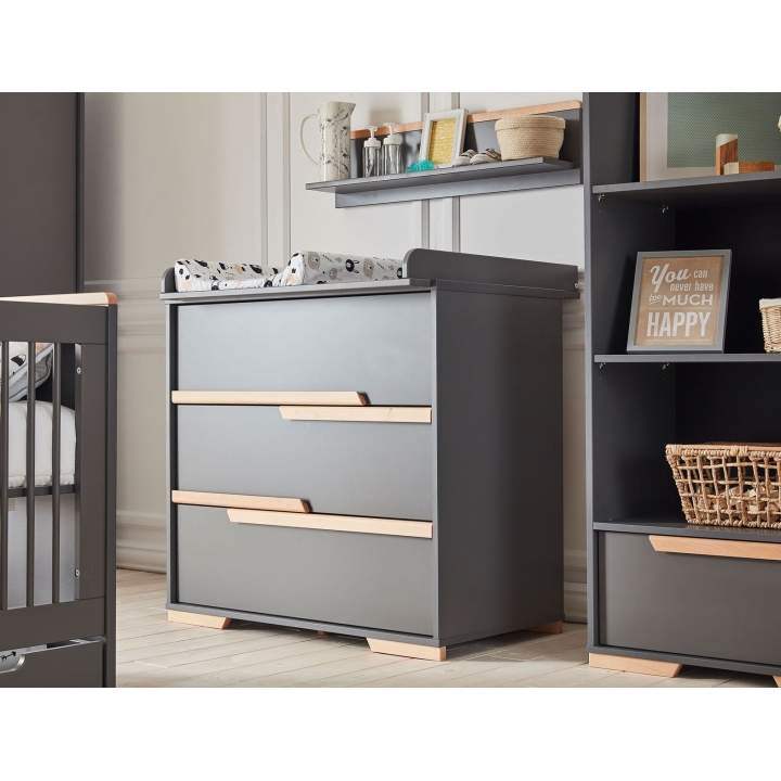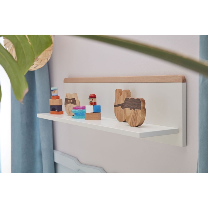 The shelf from the Snap collection is a simple, everyday solution that fits into any interior. The accessory, measuring 91 cm in length, 24 cm in height and 18 cm in depth, will easily accommodate handy cosmetics or accessories needed for baby care at . It is also ideal as a mini library. Out of concern for the health of users, the furniture was painted with ecological water-based paints. The shelf is made of painted MDF board and beech wood (elements in the colour of wood). The product is intended for self-assembly. The shelf is available in two colours: white and dark grey.