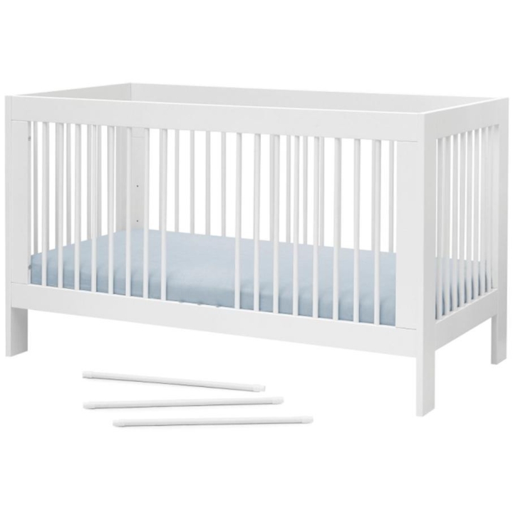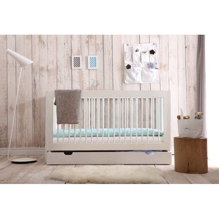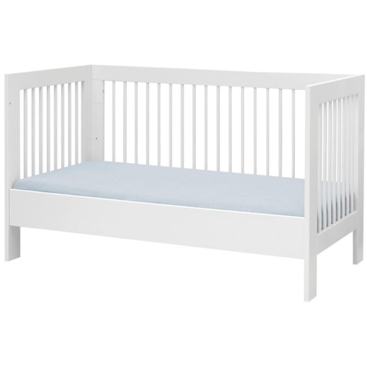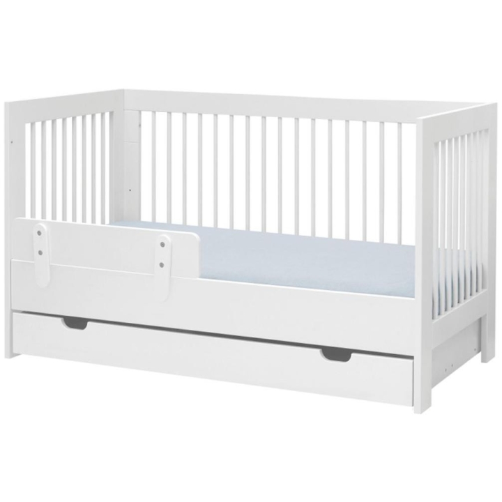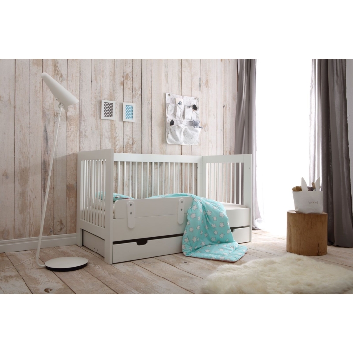 Dedicated to a mattress size of 140 x 70 cm, the stylish Basic cot is characterised by its versatility, adapting to the needs of a growing child. It has three height adjustment options for the mattress, which allows you to modify it as your little one grows, and three removable rungs for easy access to the mattress. In addition, the cot can be transformed into a couch thanks to the possibility of removing the sides (both left and right). Made from lacquered MDF board, beech wood (rungs) and laminated board (sleeper cushion), the cot guarantees solidity and style. As an option, you can purchase a safety rail, a bedding drawer and a Pinio Sensitive mattress, perfectly matched to the design. Taking care of safety and health, the product has been painted with ecological water paints which eliminate the risk of allergies. The cot is available in white.