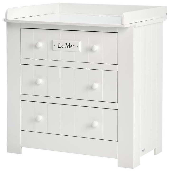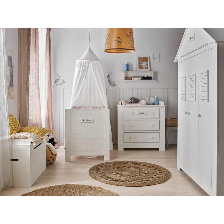 The Marsylia collection chest of drawers is a piece of furniture with an elegant design equipped with an advanced silent closing system. Measuring 100 cm long, 92 cm high and 51 cm deep, the interior of the chest of drawers provides plenty of storage space thanks to its three drawers. The chest of drawers has been designed with ease of assembly in mind . The chest of drawers is made of painted MDF (the shelves and internal components are made of laminated board). The care for the health of the users has been confirmed by the use of certified and ecological water-based paints. The Marsylia chest ofdrawers combines functionality with refined style, which is highlighted by the unique plaque and round drawer handles that give the furniture its lightness and finesse. This elegant chest of drawers is available in white. A changing pad can be purchased.