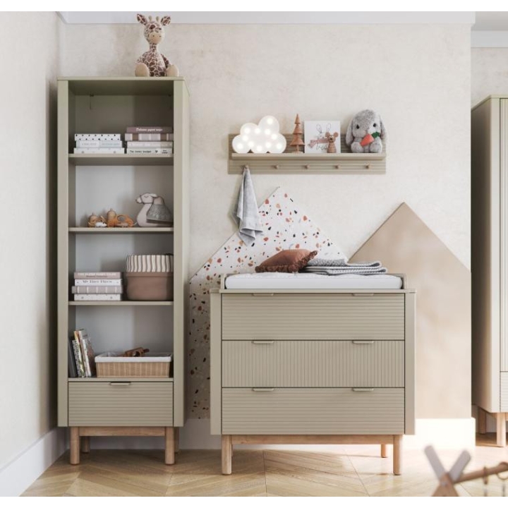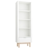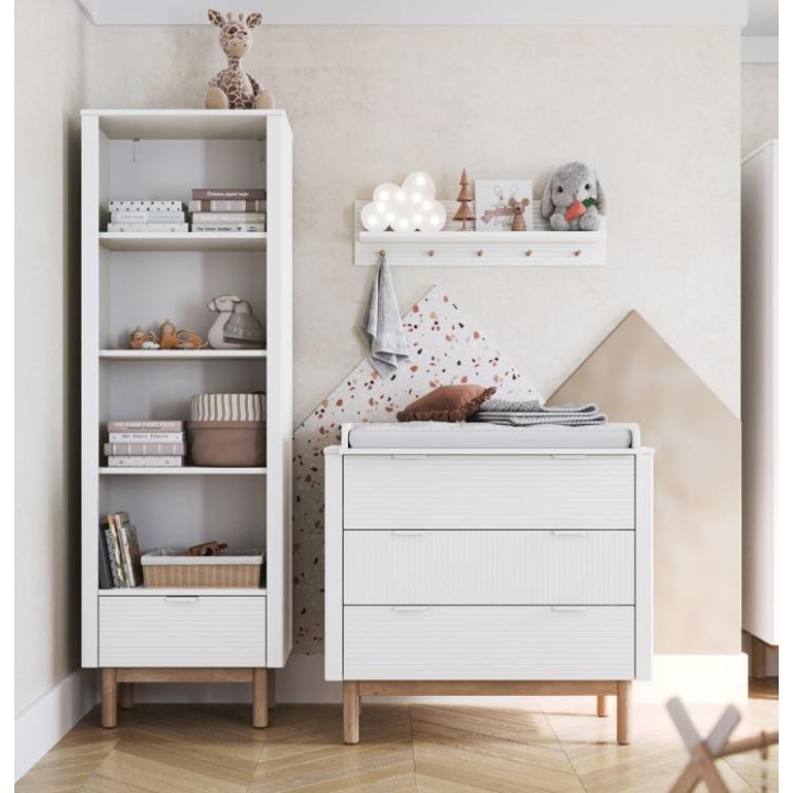 The bookcase from the Miloo collection is a piece of furniture with an elegant design. Its dimensions - 66 cm wide, 198 cm high and 53 cm deep - provide plenty of storage space thanks to four shelves and a drawer. The bookcase has been designed with ease of assembly in mind . Its front is made of painted MDF and the legs are made of solid beech wood, giving the furniture elegance and durability. Care for the health of users has been confirmed by the use of certified paints and boards with reduced formaldehyde content. The Miloo bookcase combines functionality with sophisticated style, which is emphasised by the fluted front and gently rounded corners. Aesthetically pleasing metal handles and the aforementioned wooden beech legs give the furniture lightness and finesse. This elegant collection is available in two colours: classic white and champagne.