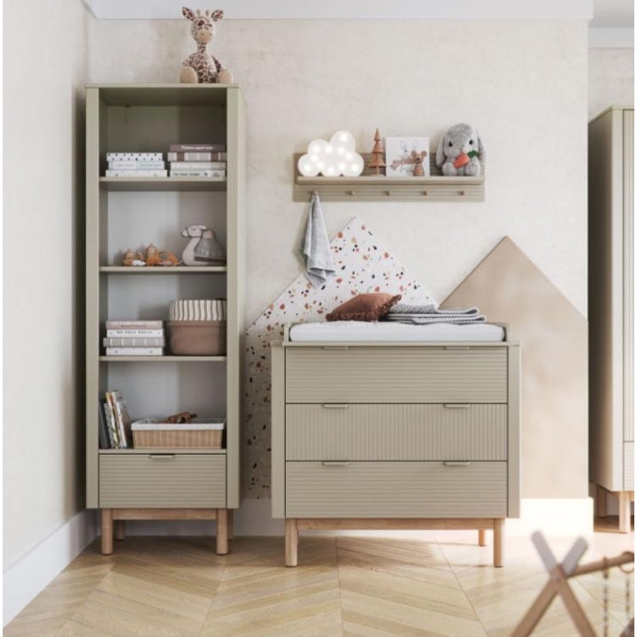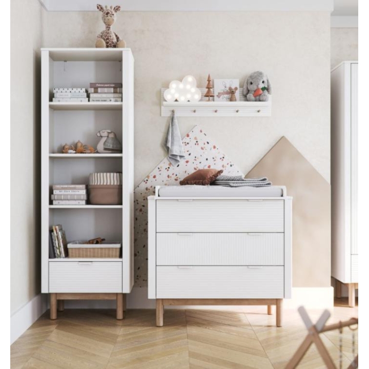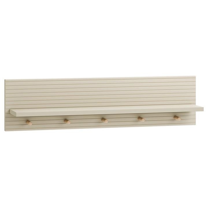 The shelf from the Miloo collection is a simple and everyday solution that fits into any interior. Measuring 88 cm in length, 23 cm in height and 17 cm in depth, the accessory will easily accommodate handy cosmetics or accessories needed for baby care. On the stylish wooden hangers you can hang clothes or towels. The accessory is also ideal as a mini bookcase. The shelf is made of solid beech wood, painted MDF board and laminated chipboard. The product is intended for self-assembly. The shelf is available in two colours: classic white and champagne.
