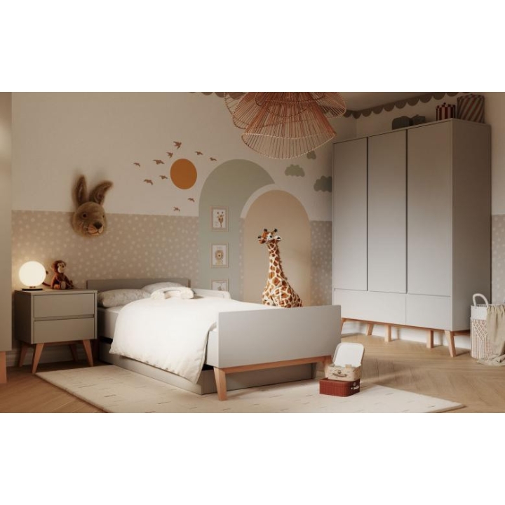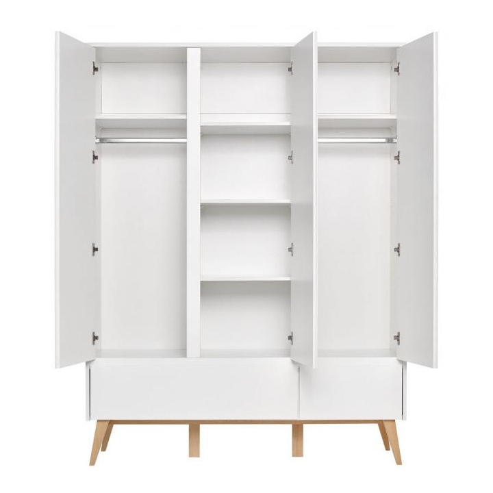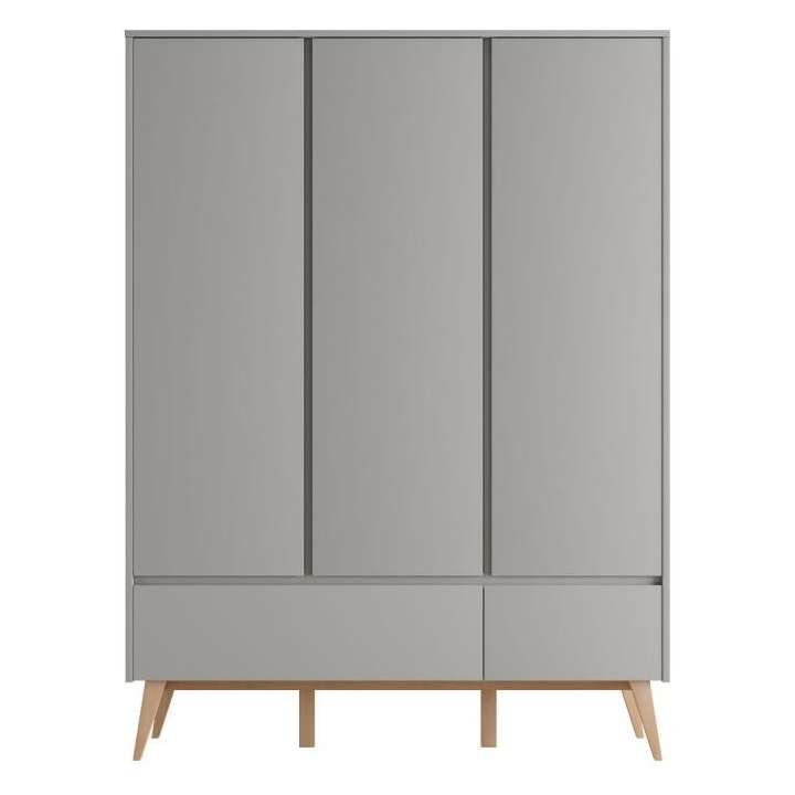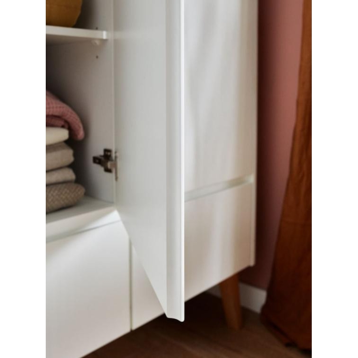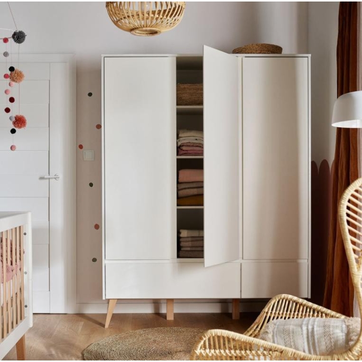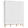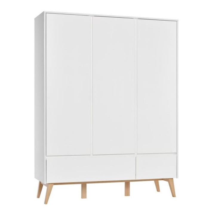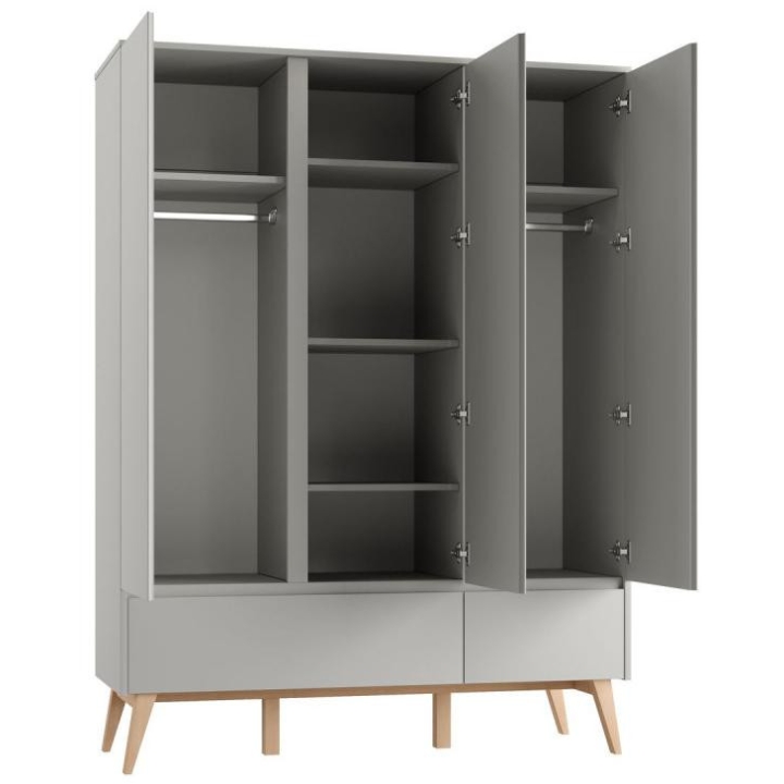 The three-door wardrobe from the Swing collection is a piece of furniture with an interesting design equipped with an advanced silent closing system. The interior of the wardrobe, measuring 149 cm wide, 200 cm high and 53 cm deep, provides plenty of storage space thanks to six shelves and two rods for hanging clothes. In addition, it is possible to purchase shelves - up to a maximum of four. The wardrobe has been designed with ease of assembly in mind, and the centre door can be fitted either on the left or right side, depending on your preference. The wardrobe is made of painted MDF (fronts), laminated board (body) and the legs are made of solid beech wood, which gives the furniture elegance and durability. Care for the health of users has been confirmed by the use of certified paints and boards with reduced formaldehyde content. The Swing wardrobe combines functionality with refined style, which is emphasised by the aforementioned wooden beech legs that give the furniture its lightness and finesse. This elegant collection is available in two colours: white and grey.