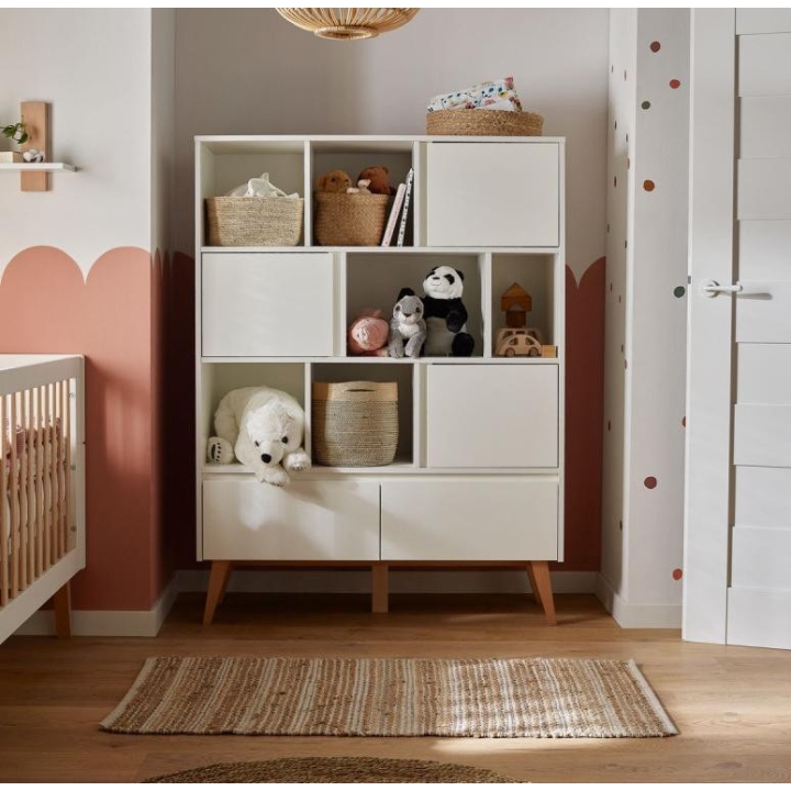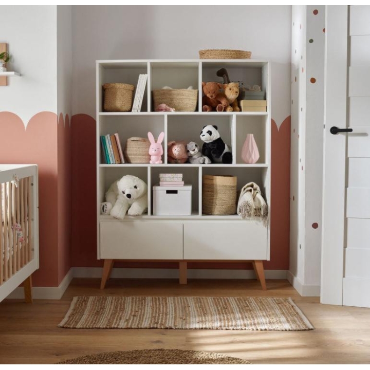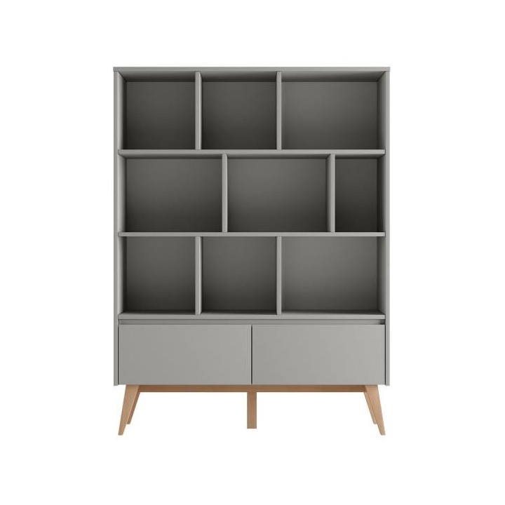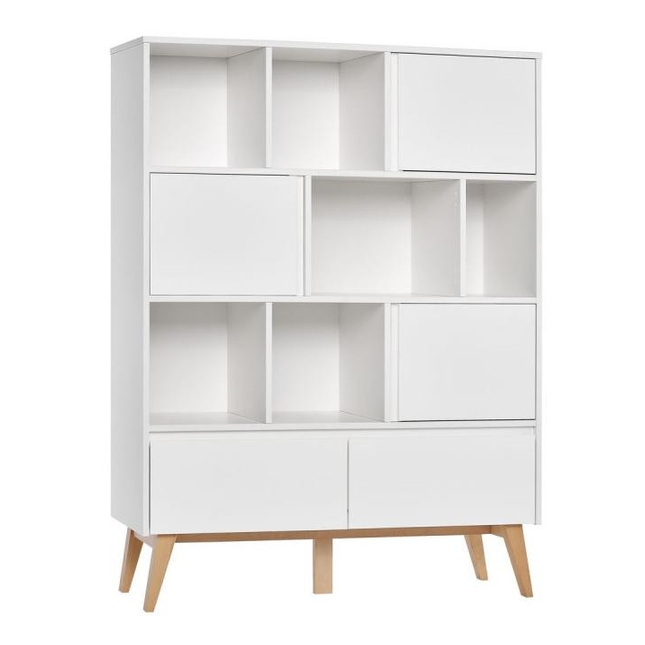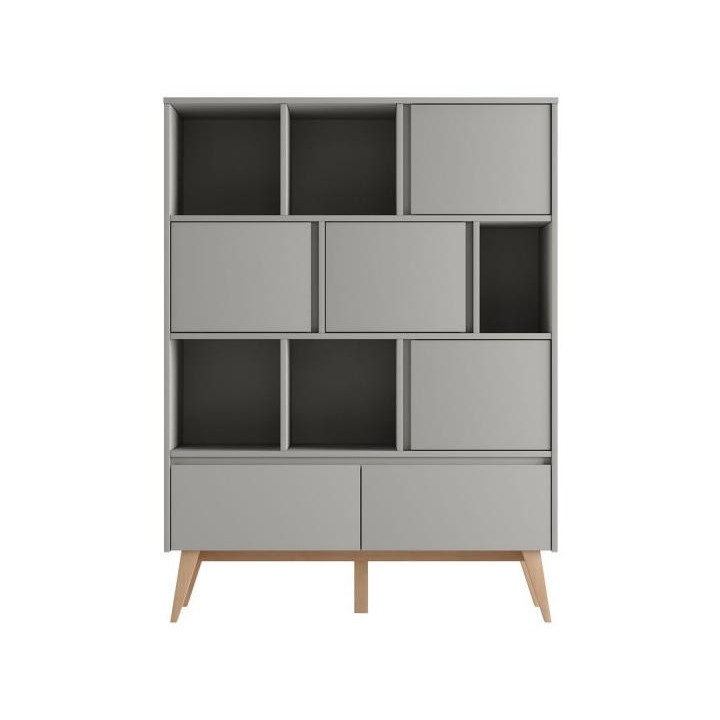 The bookcase from the Swing collection is a piece of furniture with an elegant design. Its dimensions - 120 cm wide, 160 cm high and 43 cm deep - provide plenty of storage space thanks to an asymmetrical arrangement of shelves and two capacious drawers. The bookcase has been designed with ease of assembly and convenience of use in mind, which is why the drawer runners are equipped with a brake. In addition, there is an option to purchase additional doors with which we can close part of the bookcase. A maximum of 4 doors can be purchased, as there are 4 shelves to accommodate them. Its construction is made of painted MDF, laminated board (body, internal parts) and solid beech wood (legs), which gives the furniture its elegance and durability. Care for the health of users has been confirmed by the use of certified paints. The aesthetically pleasing handleless fronts and the aforementioned beech wood legs give the furniture lightness and finesse. This elegant collection is available in two colours: white and grey.