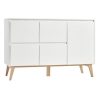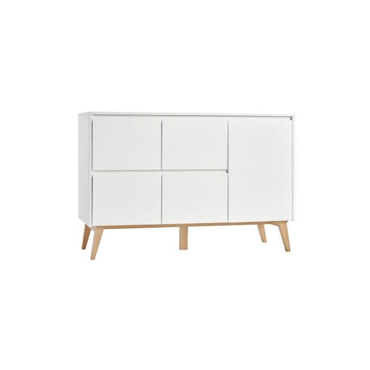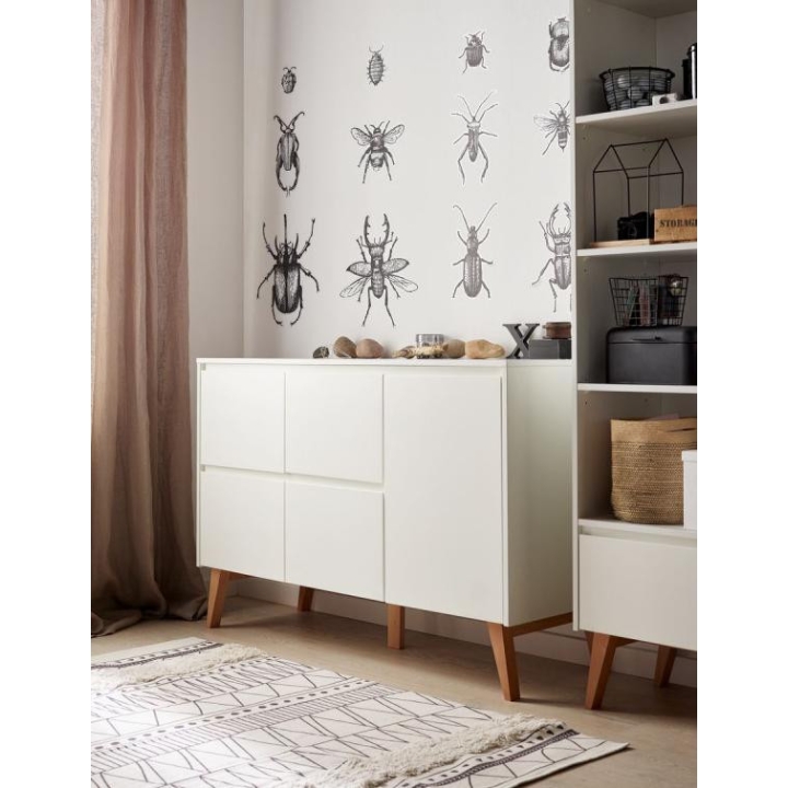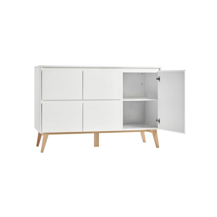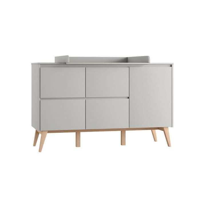 The chest of drawers from the Swing collection is a piece of furniture with a modern design equipped with an advanced silent closing system. Measuring 149 cm wide, 92 cm high and 53 cm deep, the interior of the chest of drawers provides plenty of storage space thanks to its four drawers and doors. The chest of drawers has been designed with ease of assembly in mind. The chest of drawers is made of painted MDF, laminated board (body, internal parts) and solid beech wood (legs). In addition, the user can decide whether the door is to be mounted on the left or right side. Care for the health of the users has been confirmed through the use of certified paints. The Swing chest of drawers combines functionality with refined style, which is emphasised by the handleless fronts and wooden legs that give the furniture its lightness and finesse. This elegant collection is available in white. There is an option to purchase a changing pad.