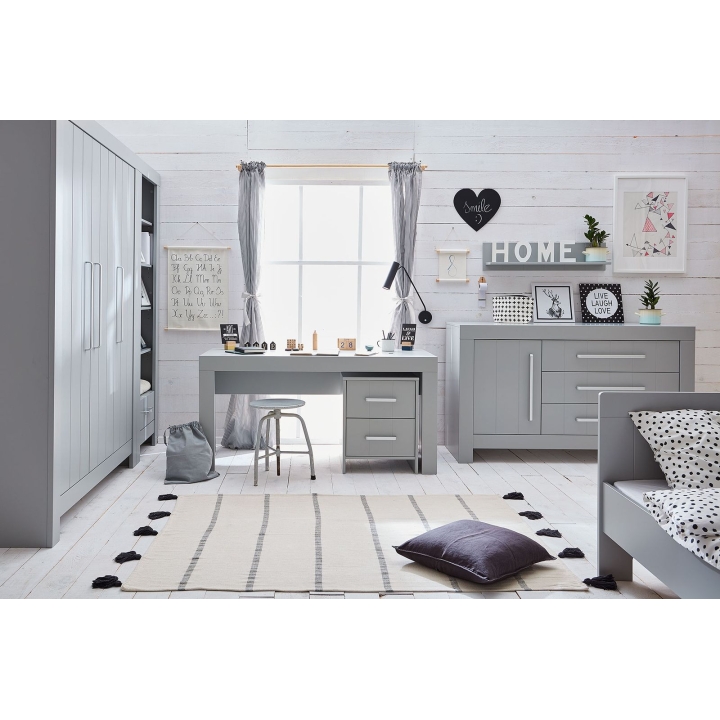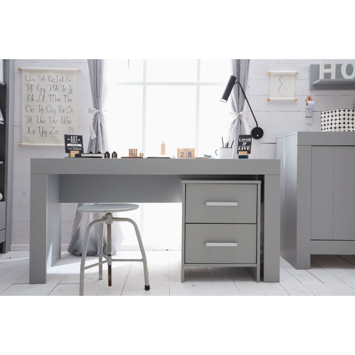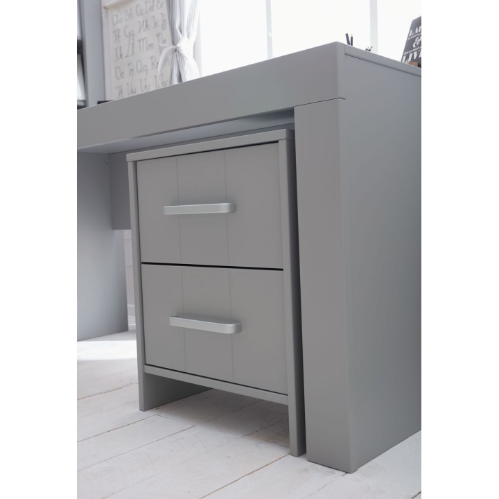 The Calmo pedestal with two drawers is the ideal accessory for those who value order and good space organisation. The furniture, with dimensions: 52 cm wide, 62 cm high and 48 cm deep, it is characterised by unique handles, as well as a silent closing system. The accessory is made of painted MDF, as well as laminated board (drawer bodies). The pedestal is available in two colours: white and grey. Product for self-assembly.