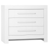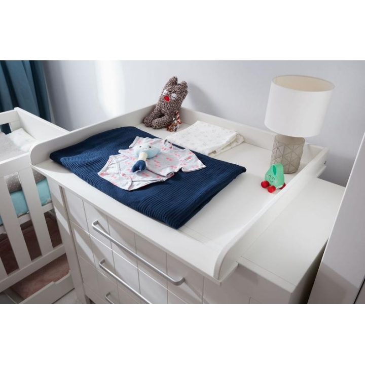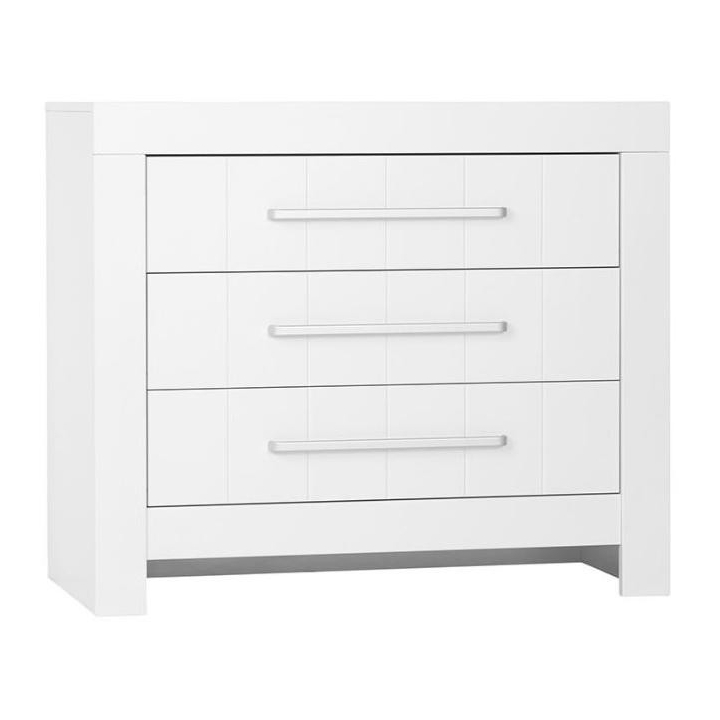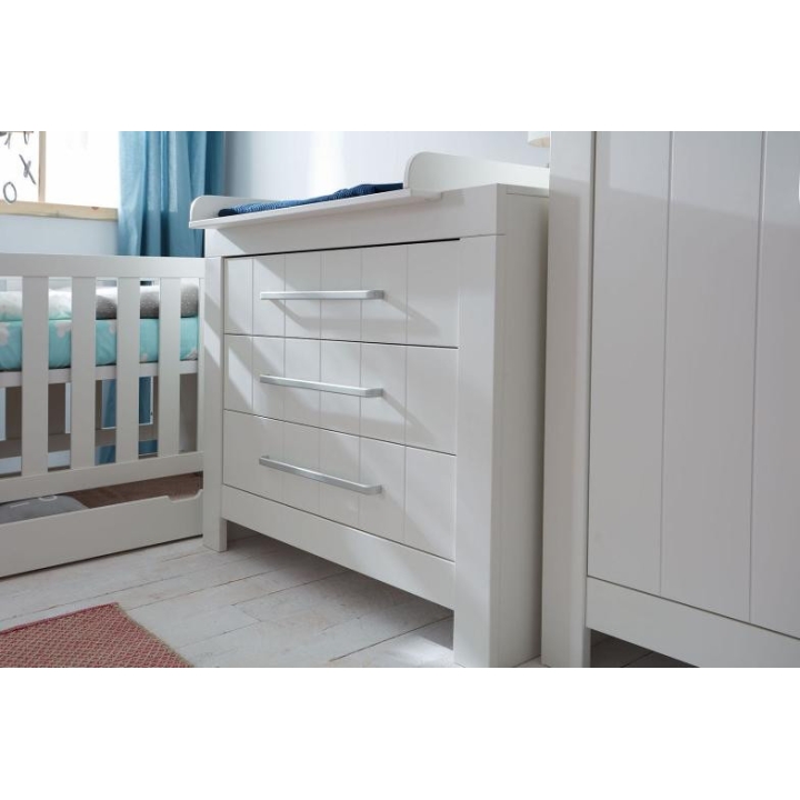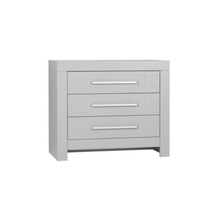 The dresser from the Calmo collection is a piece of furniture with an elegant design equipped with an advanced silent closing system. Measuring 111 cm long, 94 cm high and 56 cm deep, the interior of the chest of drawers provides plenty of storage space thanks to its three drawers. The chest of drawers has been designed with ease of assembly in mind . The chest of drawers is made of MDF and laminated board (internal components). The care for the health of the users has been confirmed by the use of certified paints. The Calmo chest of drawers combines functionality with refined style, which is emphasised by the silver handles that give the furniture its lightness and finesse. This elegant chest of drawers is available in white and grey. It is possible to purchase a changing unit.