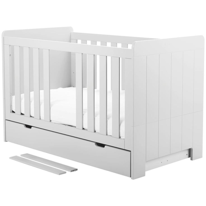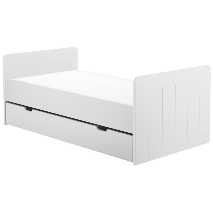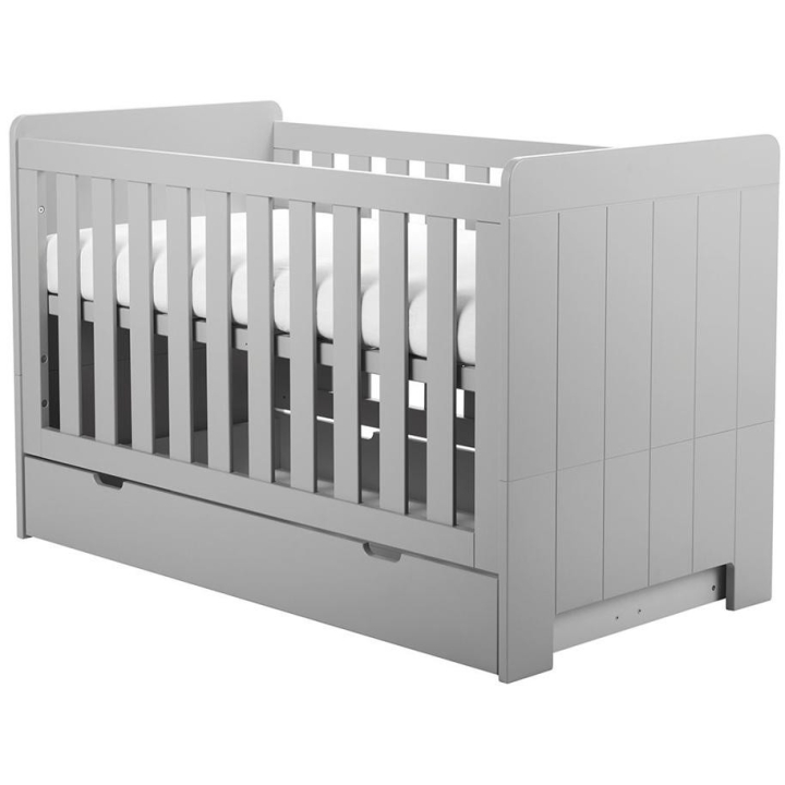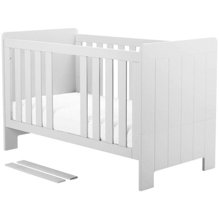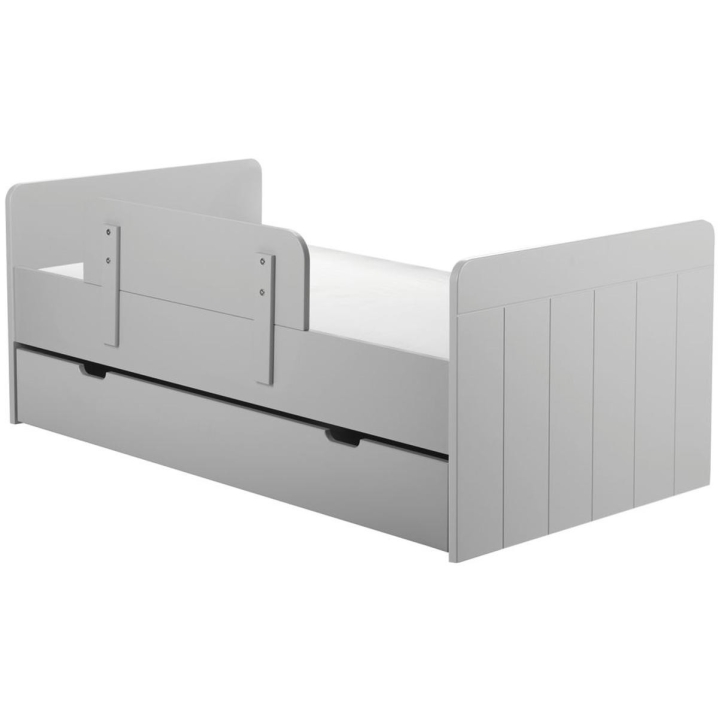 Dedicated to a 140 x 70 cm mattress size, the unique Calmo cot is characterised by its versatility, adapting to the needs of a growing child. It has three mattress height adjustment options and two removable rungs for easy access to the mattress. An innovative solution is that the sides of the cot can be removed, allowing it to be modified as your little one grows. Made of MDF board (sides with rungs, tops) and solid pine coming from Polish forests (frame), the cot guarantees solidity and style. As an option you can buy a safety rail, a drawer and a Pinio Sensitive mattress, perfectly matched to the structure. Taking care of safety and health, the product has been painted with water-based paints which eliminate the risk of allergies. The unique design of the cot is emphasised by the details - the fluted fronts add a touch of class, while the rounded corners ensure the safety of toddlers. The cot is available in white and grey.