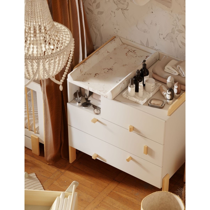 The Cube changing pad is the perfect accessory to improve both your comfort and that of your baby. The overlay is compatible with the 3-drawer chest of drawers and its dimensions are: 100 cm wide, 8 cm high and 66 cm deep. The price includes the frame, without the fabric insert (mattress). The overlay is made of laminated board and solid beech wood. The changing unit is available in light grey.