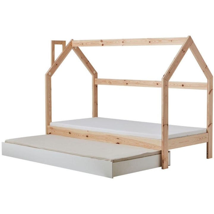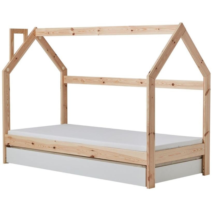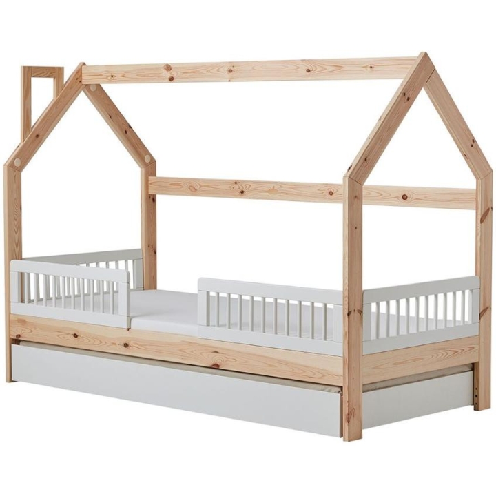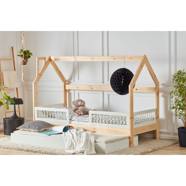The House Bed 200x90 by manufacturer Pinio is a piece of furniture that will be an extremely important place in your child's room. Stylish and modern, it will be an ideal choice for both a preschooler and a student at the beginning of their educational journey. The furniture is characterised by a unique design in the shape of a house with a chimney, and its solid construction made of pine wood together with a durable pine frame is characterised by durability. The bed is sold without a mattress, but includes an attached mattress frame. A universal design, it fits both a boy's and a girl's room. In addition, there is an option to purchase four different safety rails and a 200x90cm drawer. The advantage of the drawer is that you can put a mattress in it and it will function as a second bed. The product requires self-assembly.