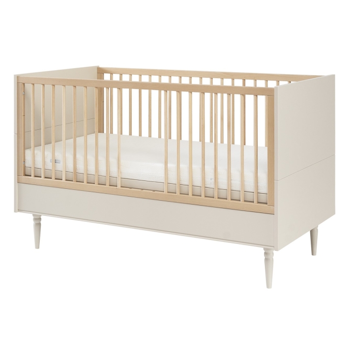 The 140x70 children's cot from the Petite collection by Pinio is a proposal for the baby's room, which combines functional qualities with a simple, classic form. The model in champagne colour has been made from a combination of solid beech wood (rungs and legs), pine wood (frame) and laminated chipboard (tops and headboard). The width of the cot is 75.2 cm, the length is 143.6 cm, the height is 89.4 cm and the mattress area is 140x70 cm. The legs are slim and tapered towards the bottom, which gives the overall look a lightweight appearance and makes it easy to keep clean around the furniture.