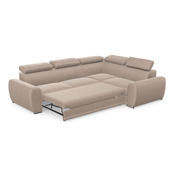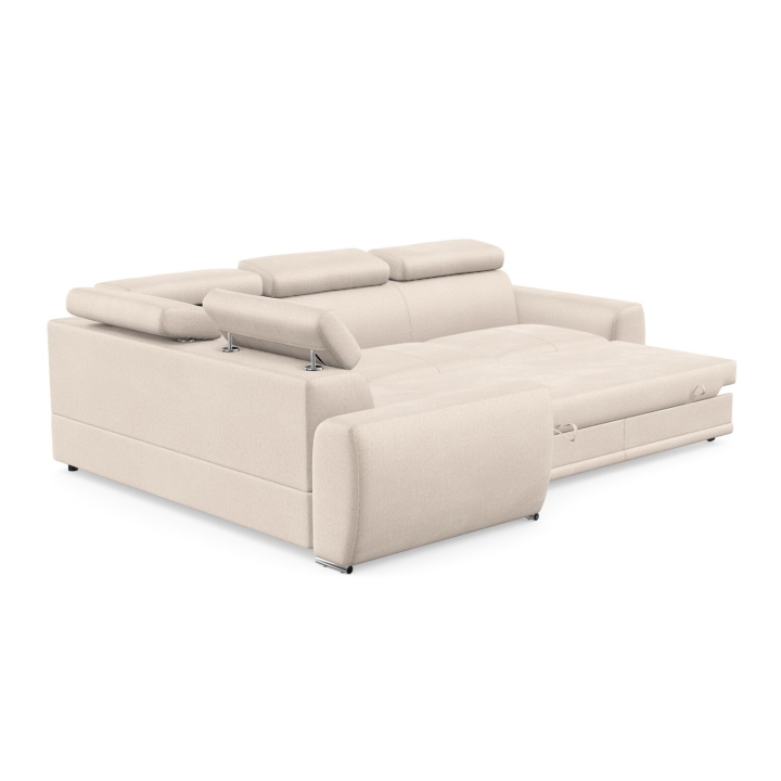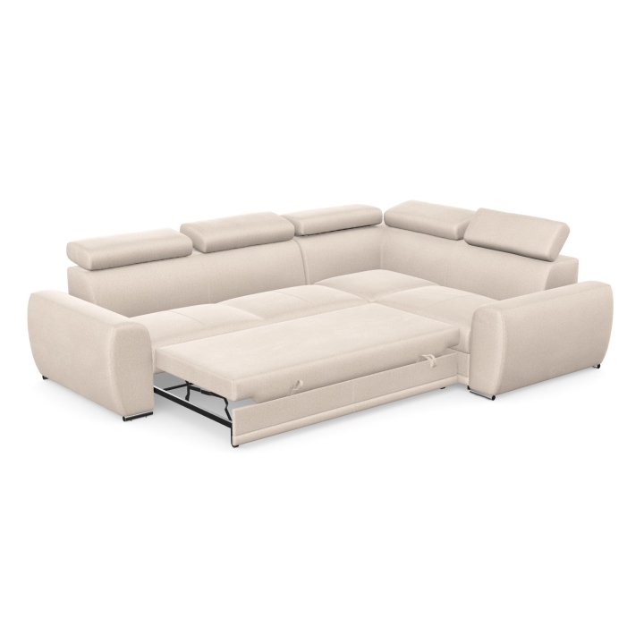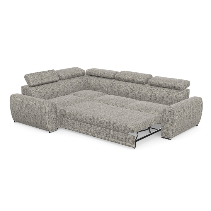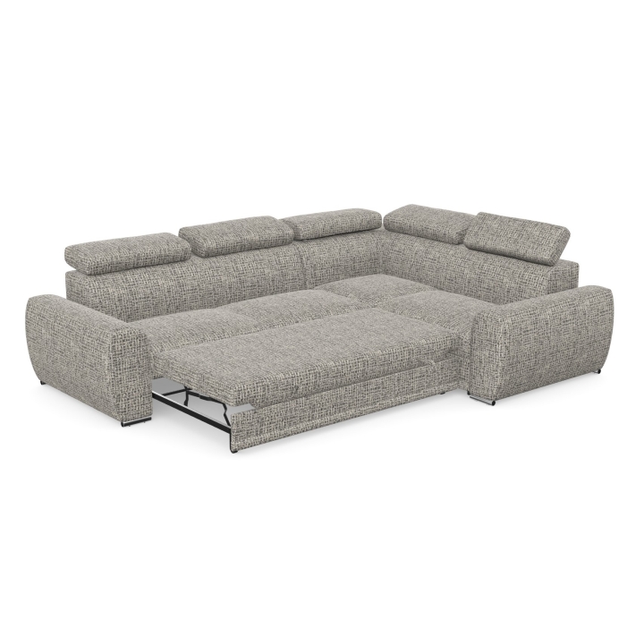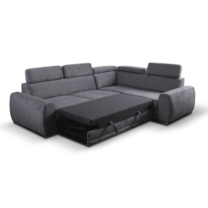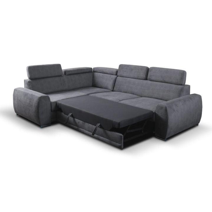 An additional advantage of the model is the dolphin-type sleeping function, which allows the corner sofa to be quickly transformed into a 205x130 cm bed. The mechanism consists in sliding the lower drawer out from under the seat and lifting the mattress to create a uniform sleeping space. The stability of the structure and comfort in everyday use is ensured by the use of a profiled corrugated spring in the seat and backrest combined with polyurethane foam.