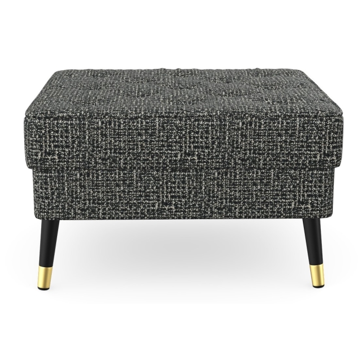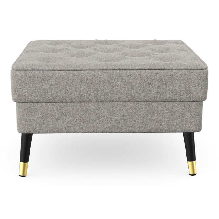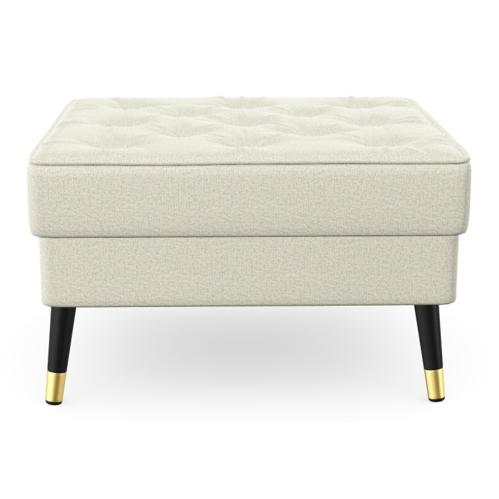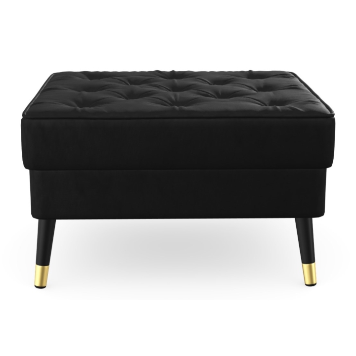 The pouffe is made of polyurethane foam with a density of 30 kg/m³, reinforced with a profiled wave spring to ensure stability and comfort. The whole is supported by slender black legs with gold tips, which add lightness to the structure. The upholstery of the pouffe is complemented with decorative quilting, which emphasises its timeless and sophisticated style.