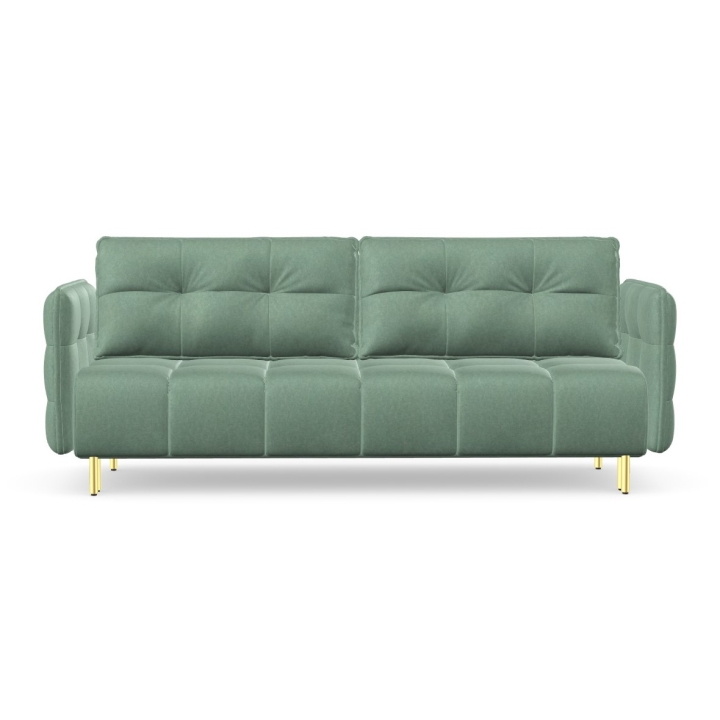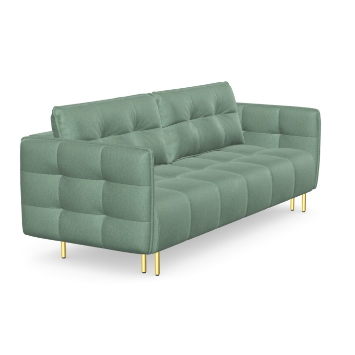 Attention is drawn to the refined details, including the aesthetically pleasing stitching on the seat, backrests and sides, which add character to the whole. The sofa is set on slender, golden metal legs that contrast with the colour of the fabric, introducing a subtle visual accent to the interior. The high legs also contribute to the comfort of cleaning the space underneath the furniture and enhance the impression of lightness of the structure.