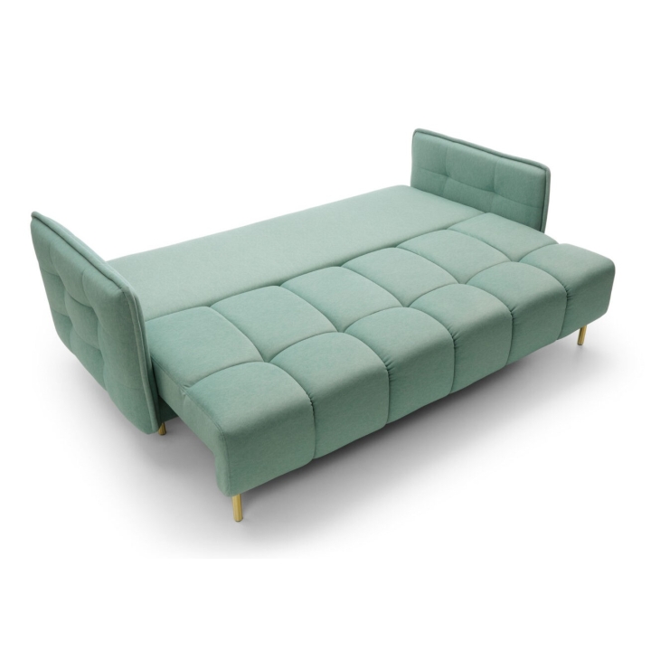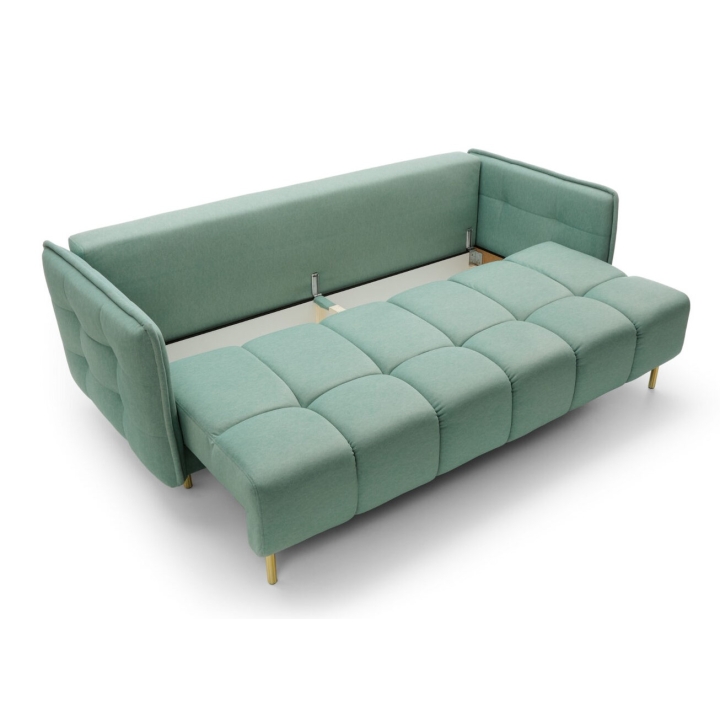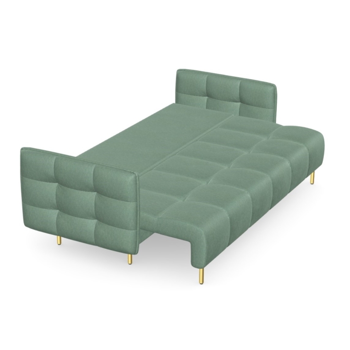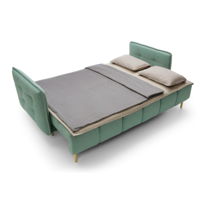 The furniture is equipped with a DL sleeping function, which allows the sofa to be quickly transformed into a 200x140 cm sleeping surface. The mechanism of operation is based on sliding the seat forward and placing the backrest into the resulting space, which makes it possible to obtain a uniform, comfortable surface. An additional feature is the hidden bedding container, ideal for storing a spare set of pillowcases or seasonal textiles.