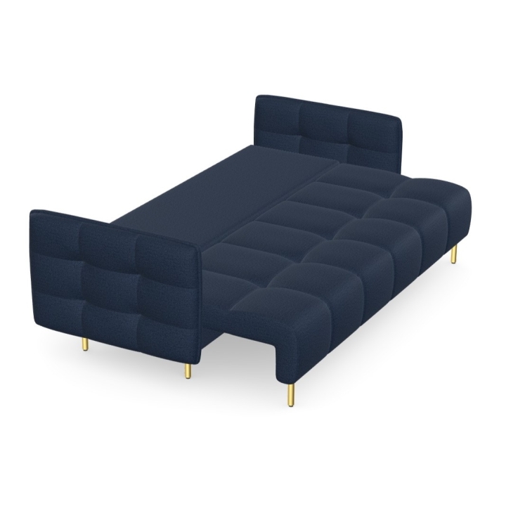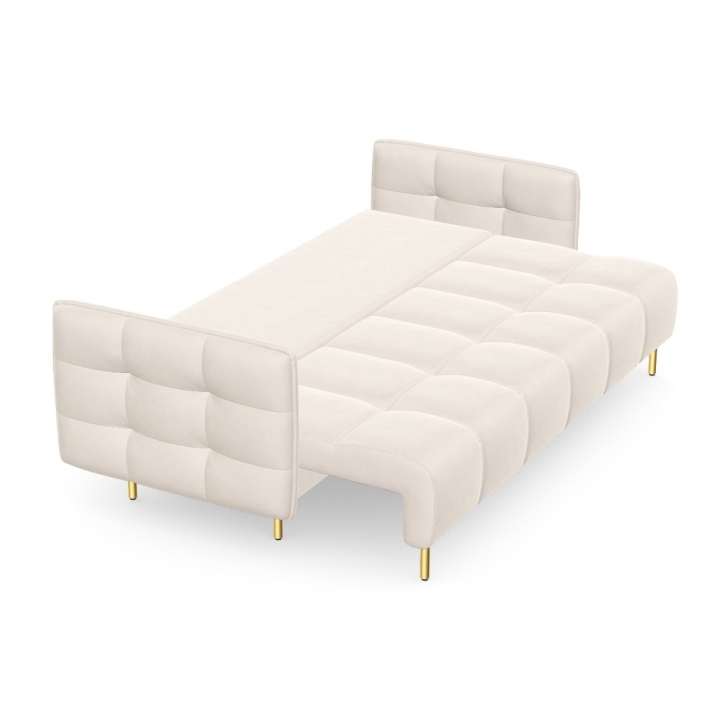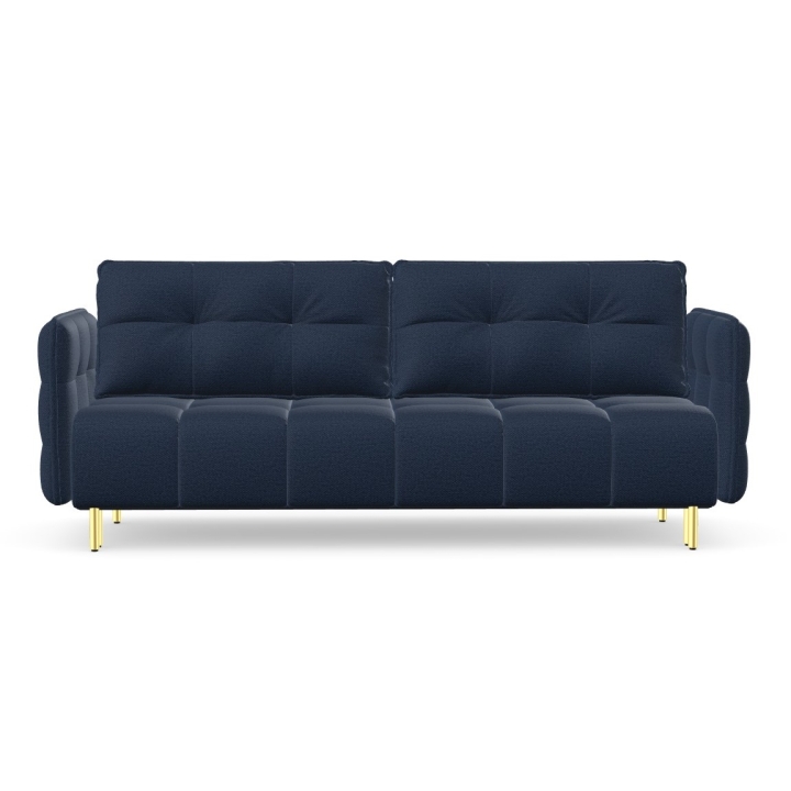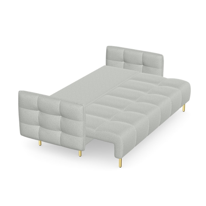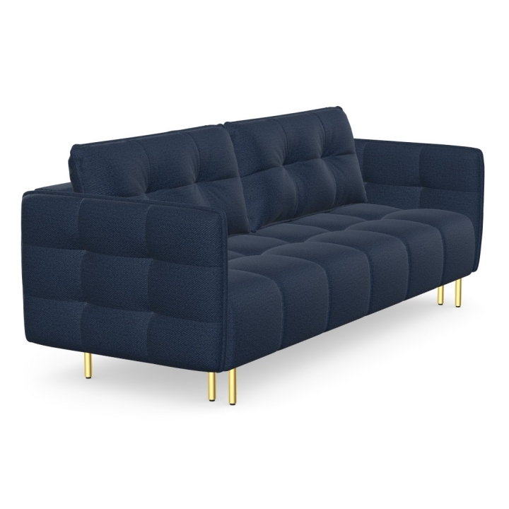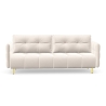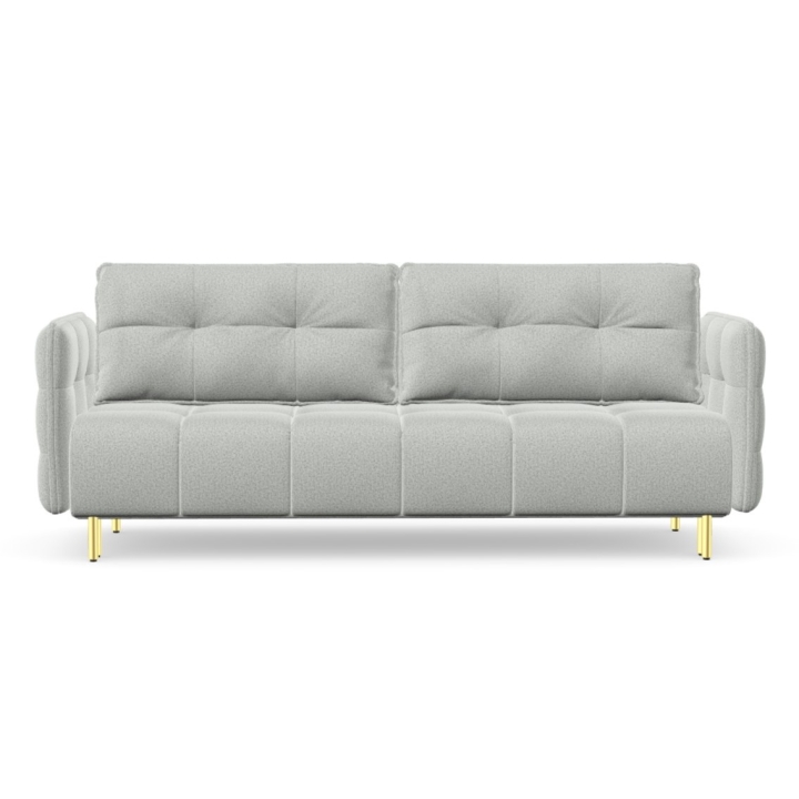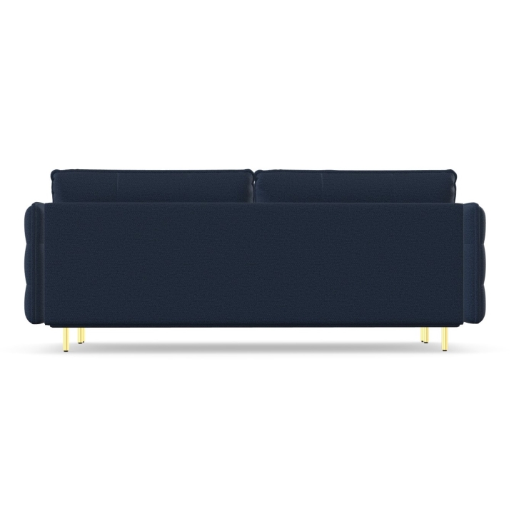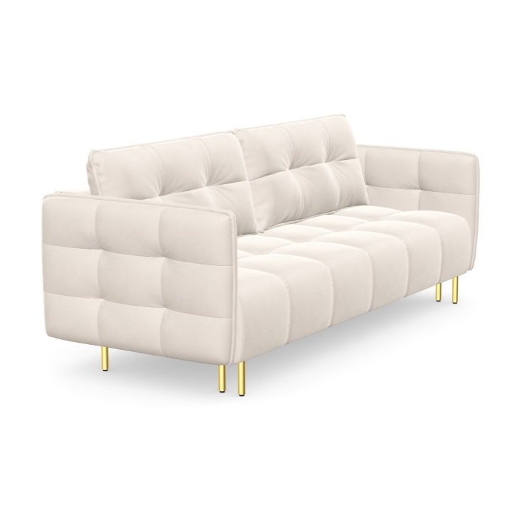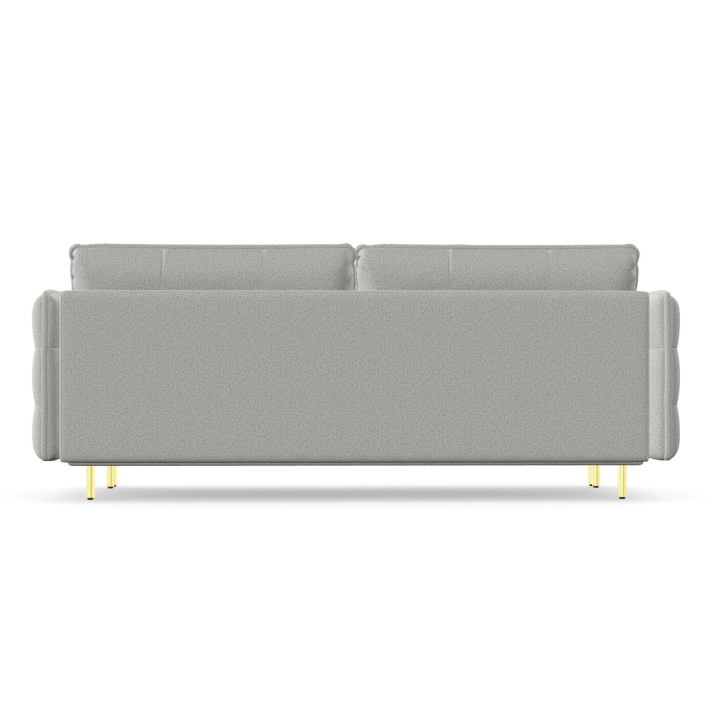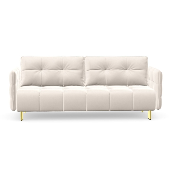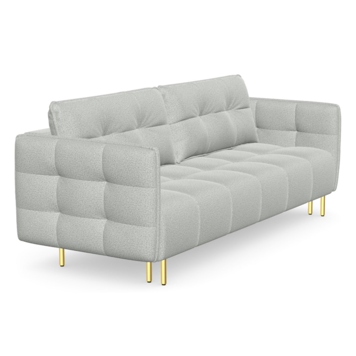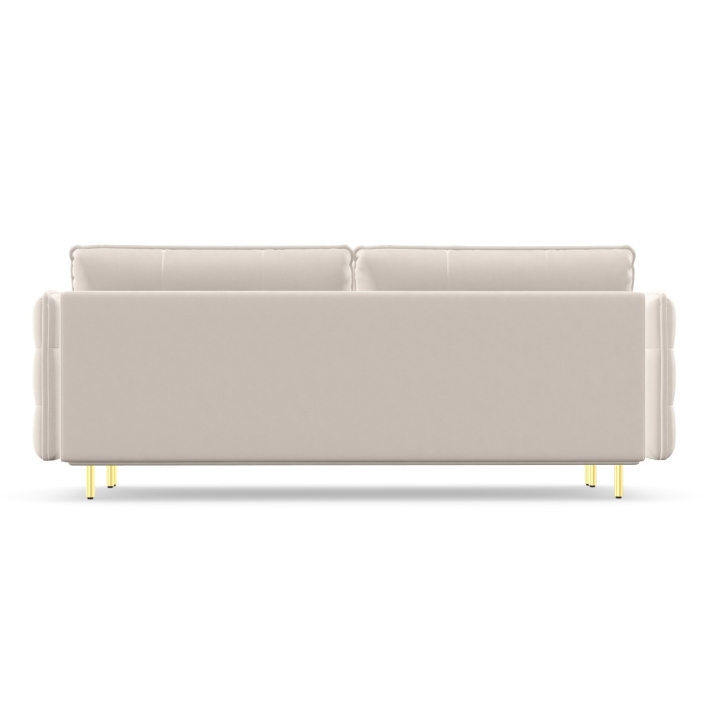 Attention is drawn to the refined details, including the aesthetically pleasing stitching on the seat, backrests and sides, which add character to the whole. The sofa is set on slender, golden metal legs that contrast with the colour of the fabric, introducing a subtle visual accent to the interior. The high legs also contribute to the comfort of cleaning the space underneath the furniture and enhance the impression of lightness of the structure.