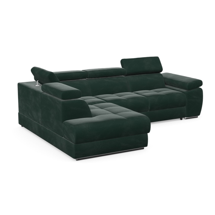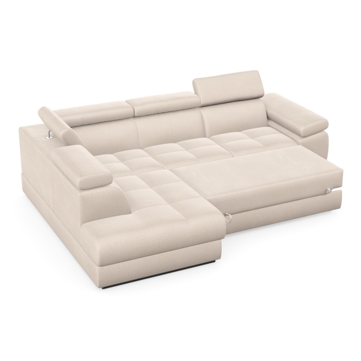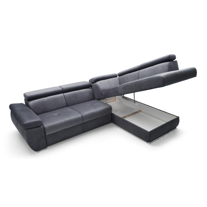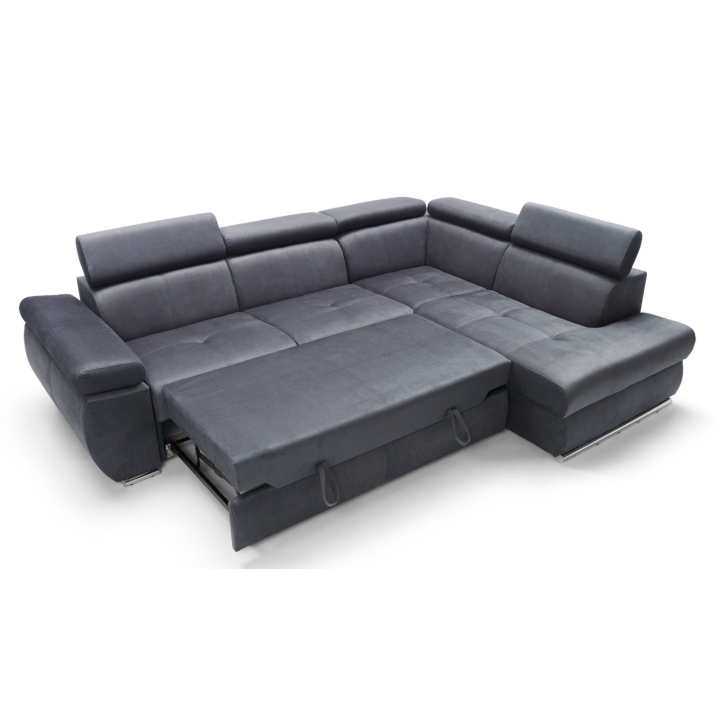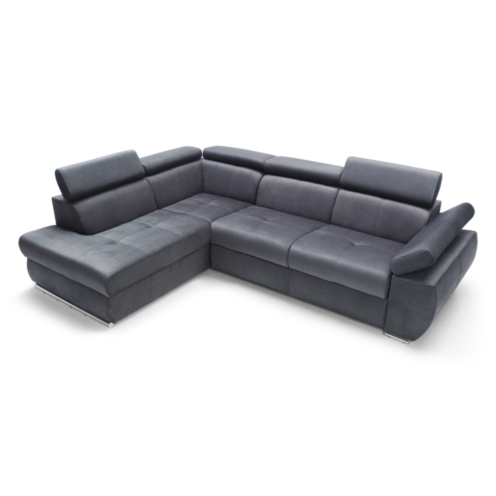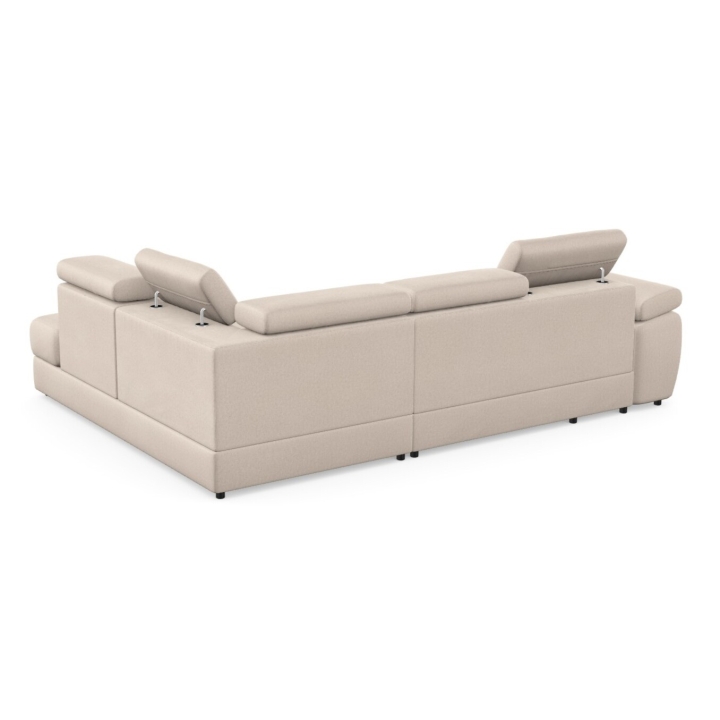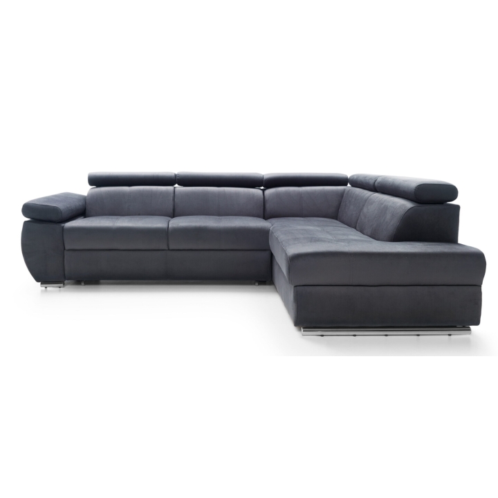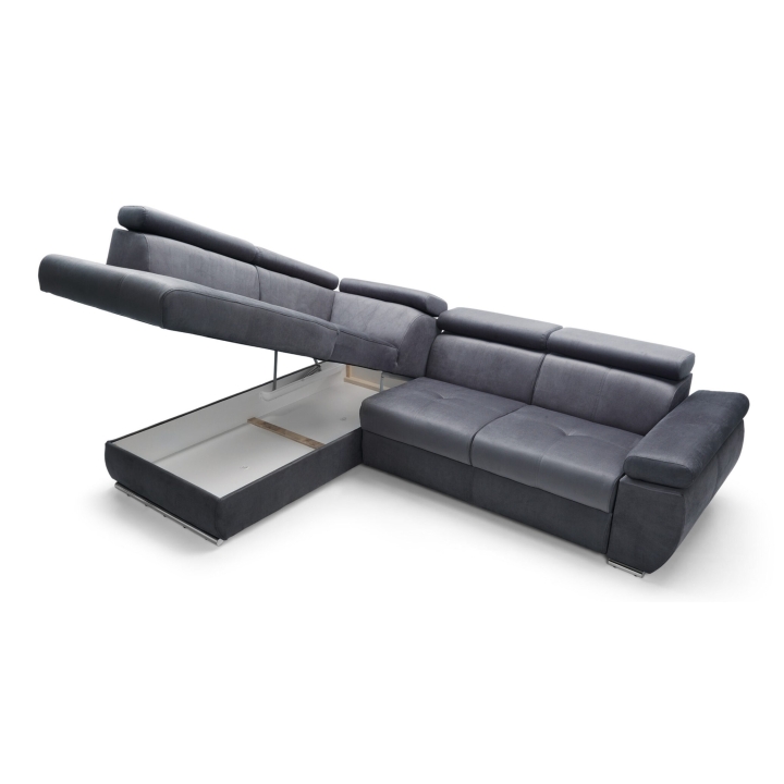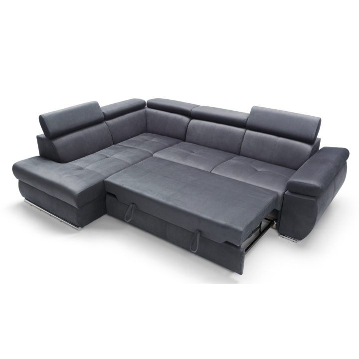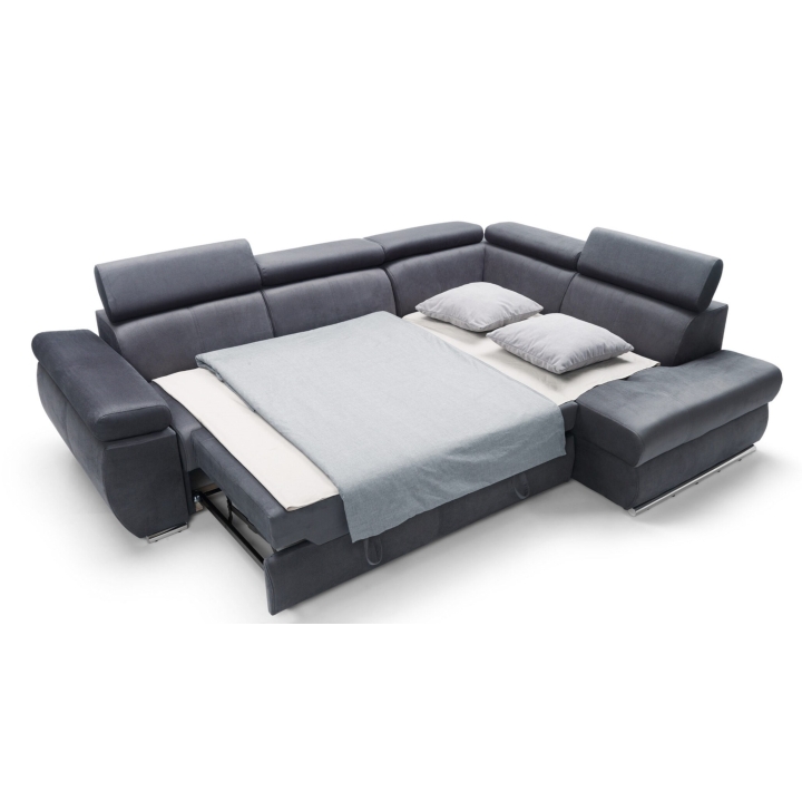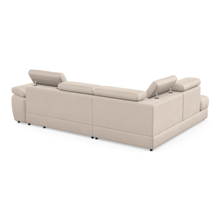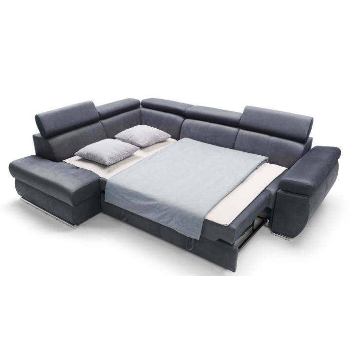 Adjustable headrests and armrests allow the Lizbona II corner sofa to be tailored to individual needs, offering additional support for the head and spine during longer rests or movie screenings. The dolphin-type sleeping function allows you to quickly create a 200x130 cm area - simply slide the lower drawer out from under the seat and lift the hidden mattress to create a level sleeping space. This solution is perfect for everyday use and for guests.