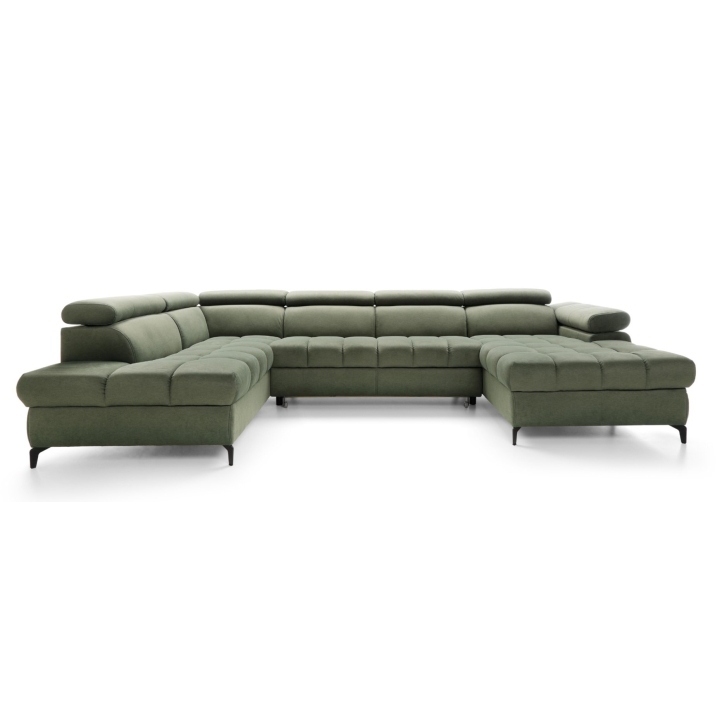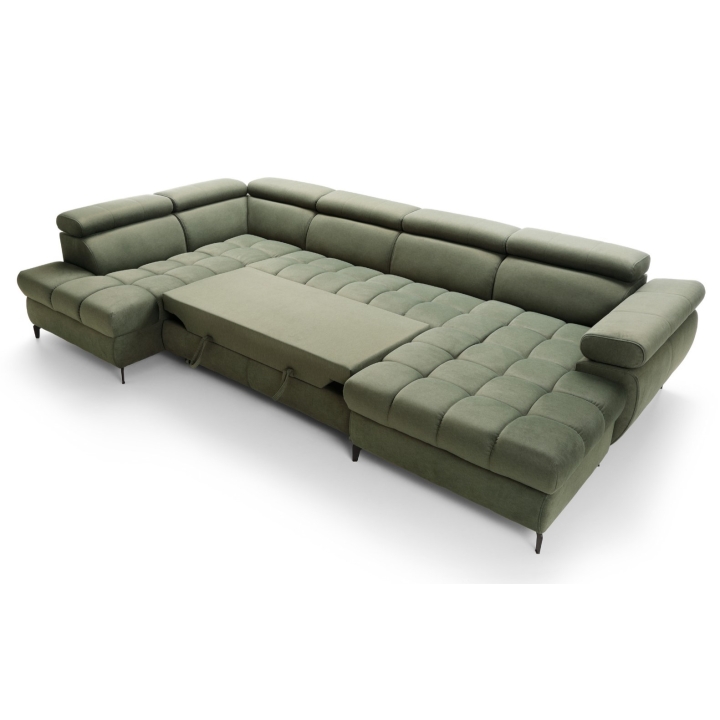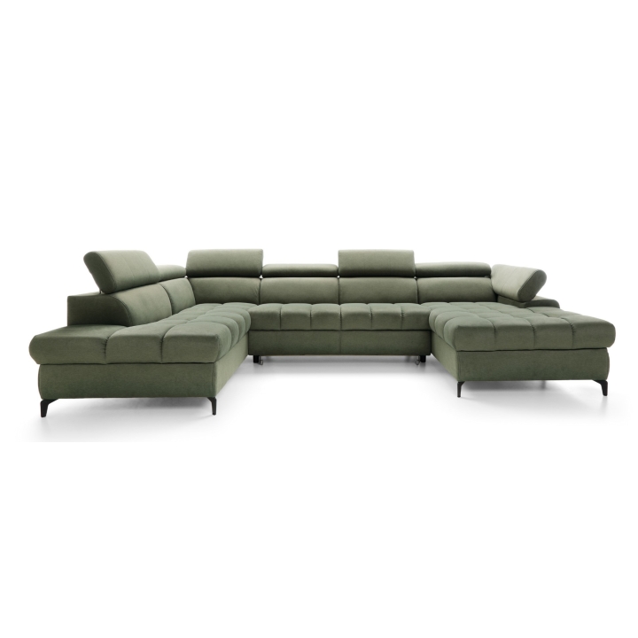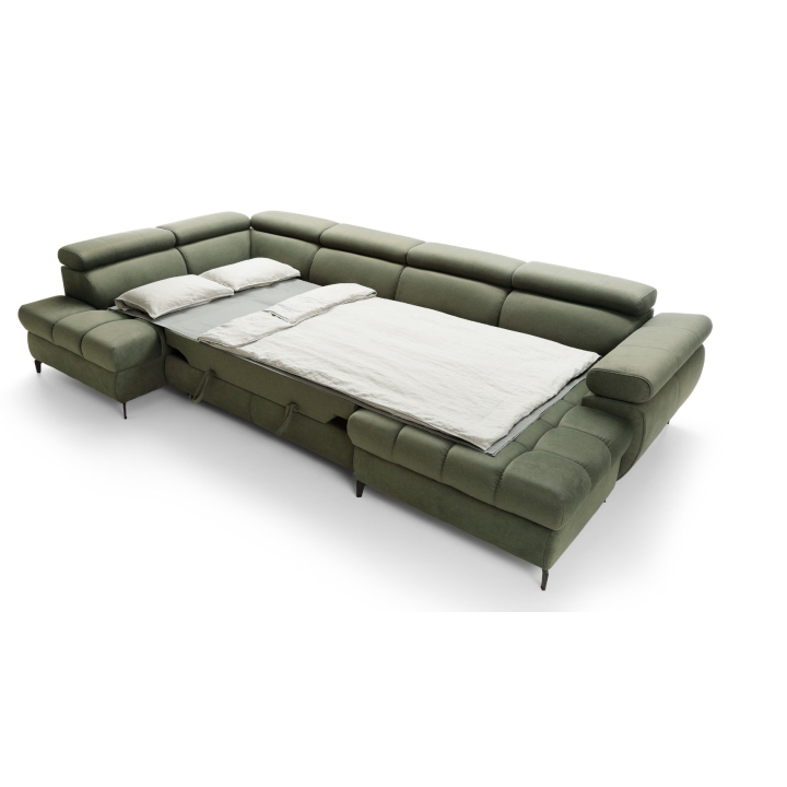 The construction of the corner sofa provides two containers for bedding, which are discreetly hidden inside the furniture. The storage compartments will accommodate not only sets of bedding, but also cushions or extra blankets, supporting tidiness in the living area. The whole is based on a corrugated spring and high resilience foam, which contributes to the stability of the seat and proper support for the back.