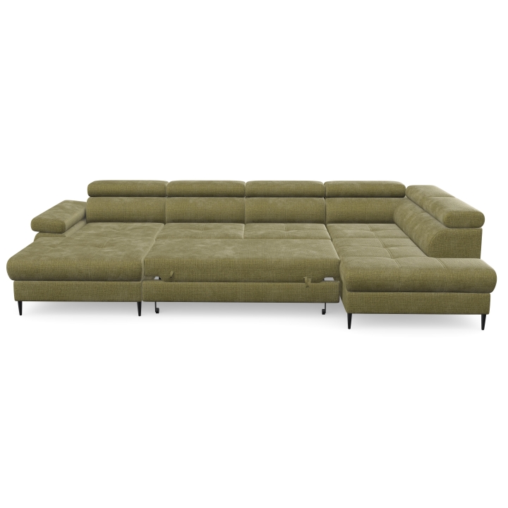 The Cordoba III Pushman corner sofa is a large upholstered lounge furniture with awidth of 346 cm and a corner module depth of 203 cm, which is ideal as a corner sofa for the living room. The model is equipped with folding headrests, which increase the comfort of daily rest and support the cervical section. The high black steel legs , 13 cm high, give the corner sofa its lightness and match modern interior design. The seat has a width of 270 cm and a depth to the backrest of 59 cm,a height of 47 cm which gives a large seating area.