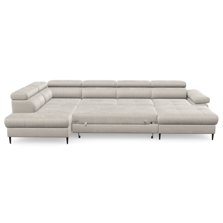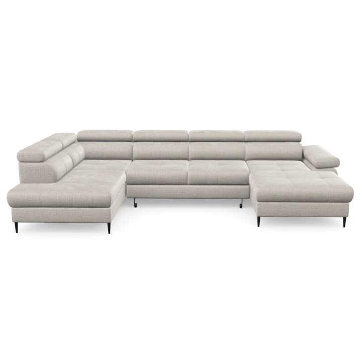 The Cordoba III Pushman corner sofa is a large upholstered lounge furniture with awidth of 346 cm and a corner module depth of 203 cm, which is ideal as a corner sofa for the living room. The model is equipped with folding headrests, which increase the comfort of daily rest and support the cervical section. The high black steel legs , 13 cm high, give the corner sofa its lightness and match modern interior design. The seat has a width of 270 cm and a depth to the backrest of 59 cm,a height of 47 cm which gives a large seating area.