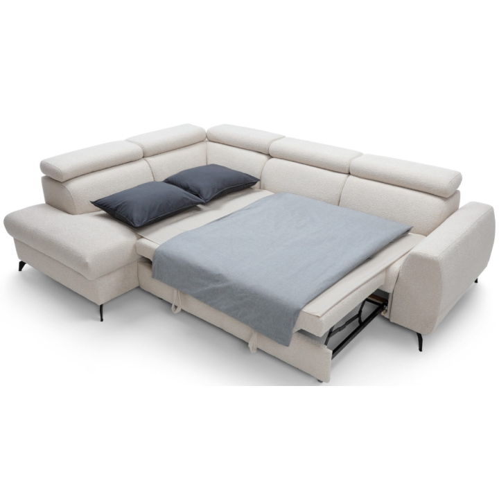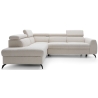 The seat of the corner sofa is made on the basis of a corrugated spring and a profiled corrugated spring, which, combined with 30 kg/m³ PU foam, ensures durability, comfort and resistance to deformation. The model has a dolphin-type sleeping function, which allows you to quickly prepare a place for a night's rest, and a bedding container, ideal for storing an extra duvet or pillows. The sleeping surface is 130x202 cm. The upholstery of the corner sofa is Castel 03 easy-to-clean fabric, which combines durability with a pleasant tactile finish.