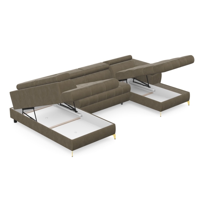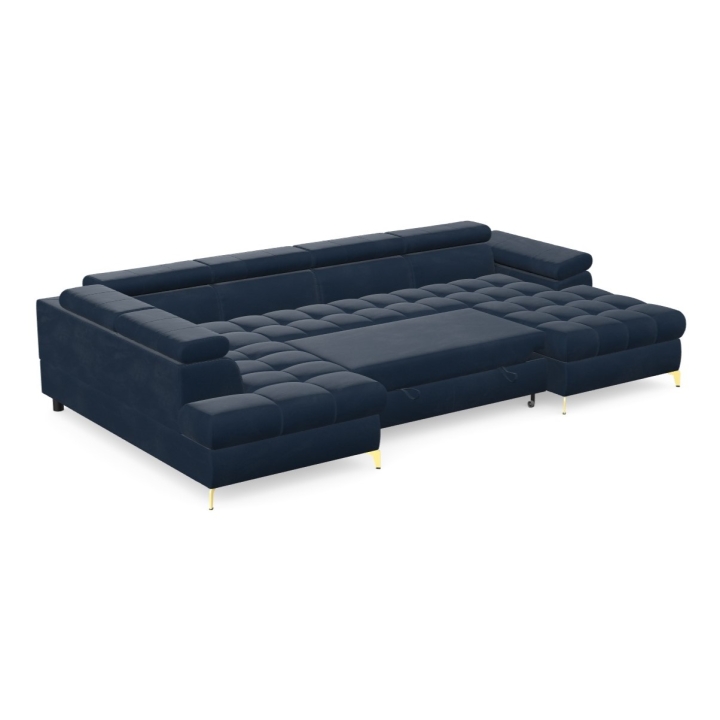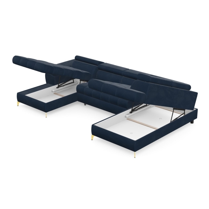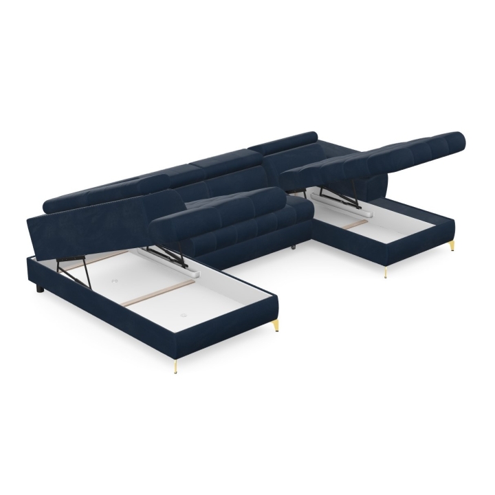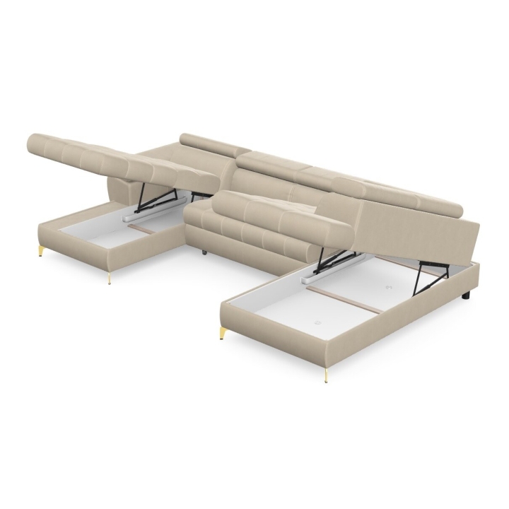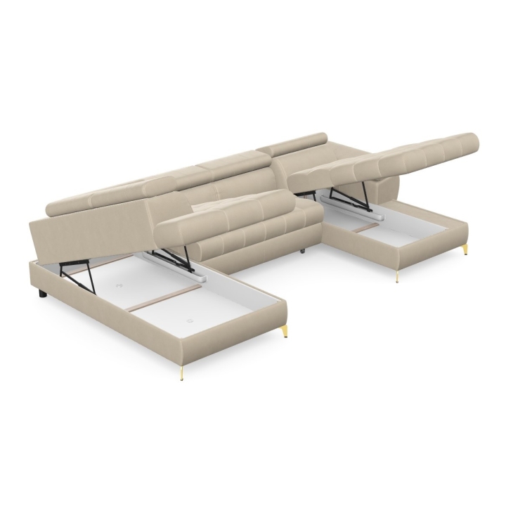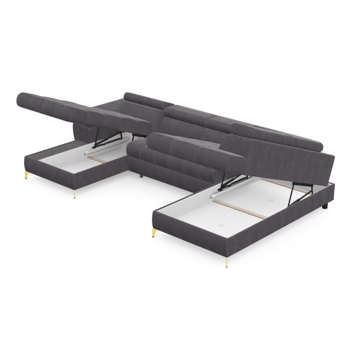 Hidden inside the corner sofa are two bedding bins, which help to keep things tidy and allow storage of extra blankets or cushions. Highly elastic foam filling and corrugated springs guarantee proper back support and seat stability, even with intensive use.