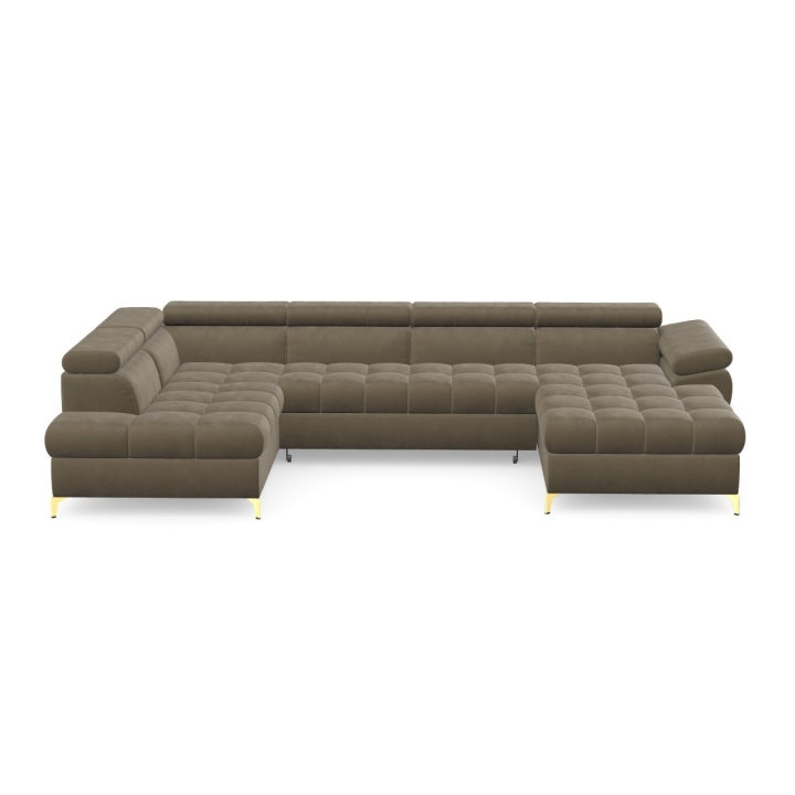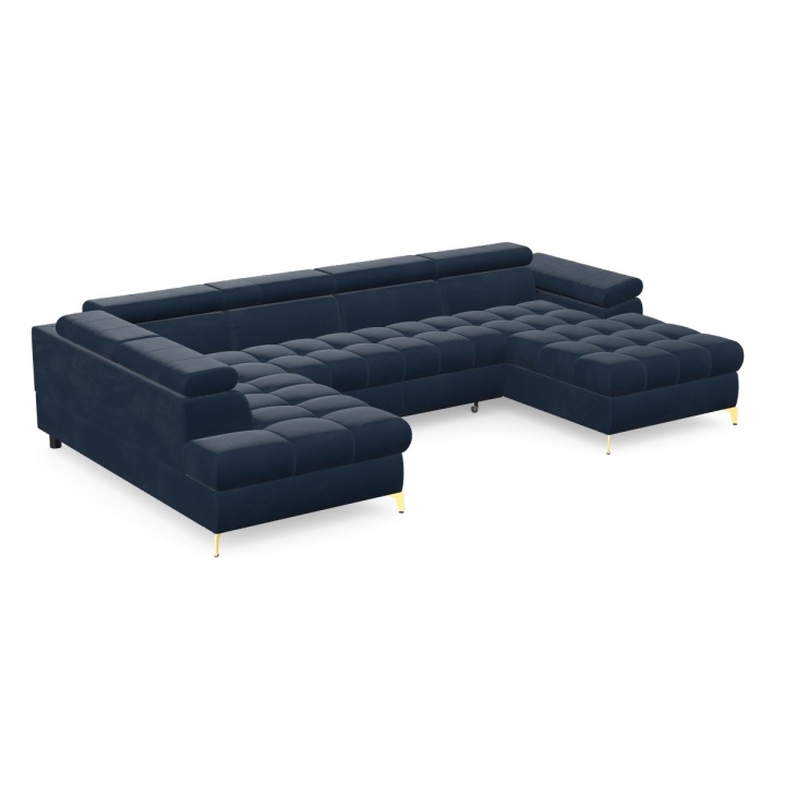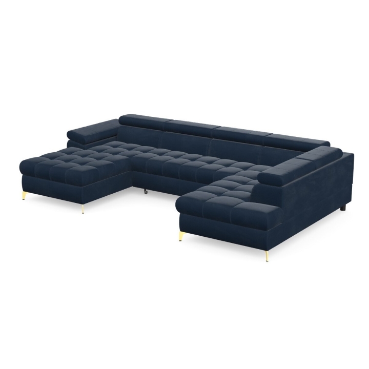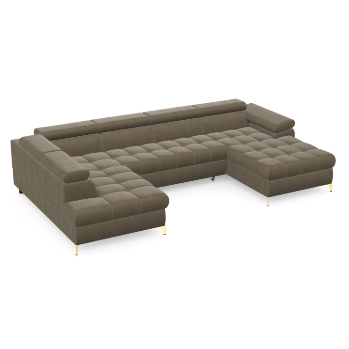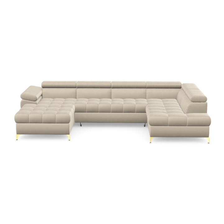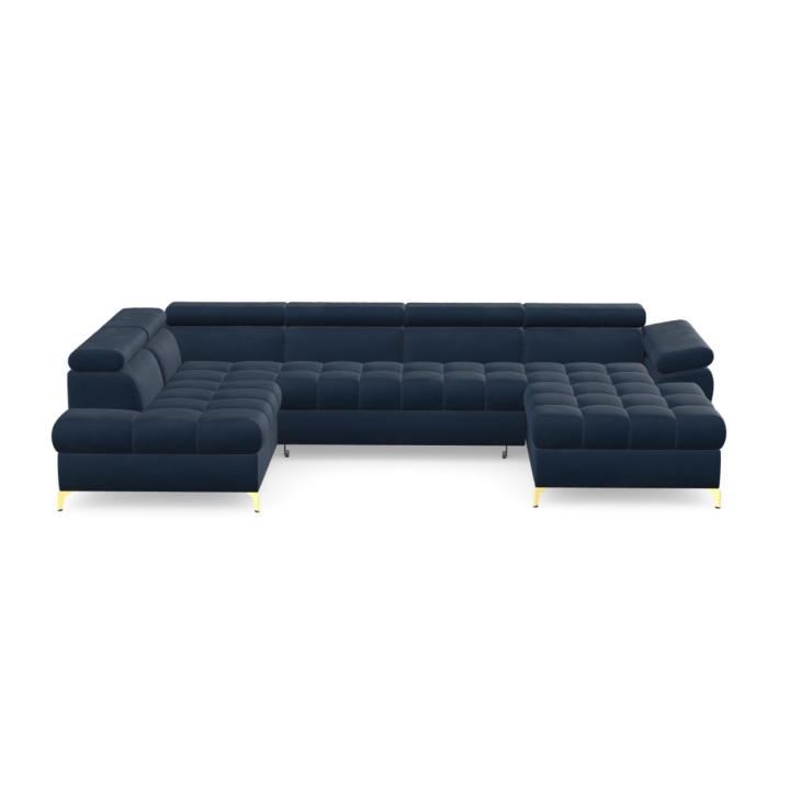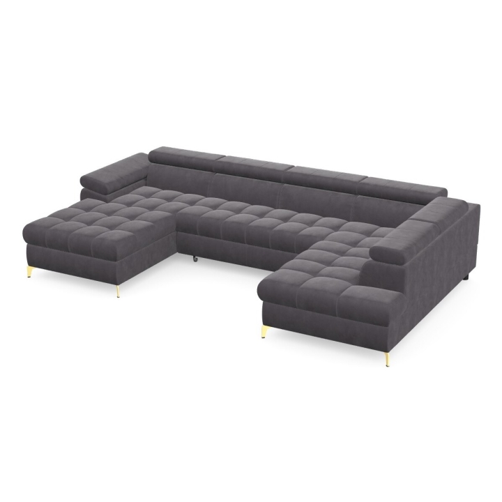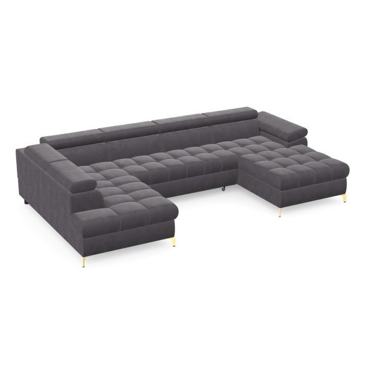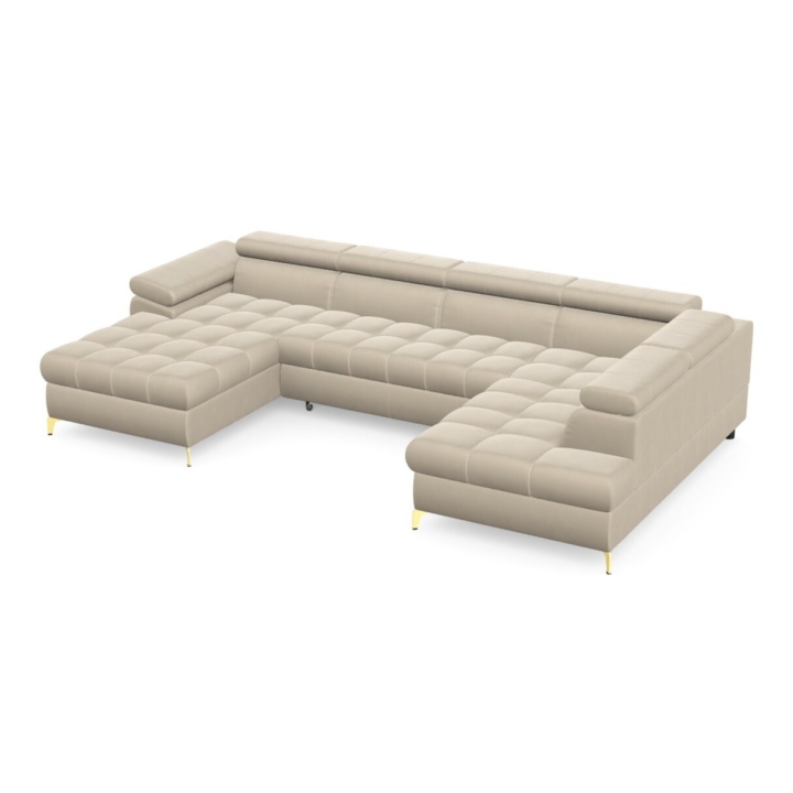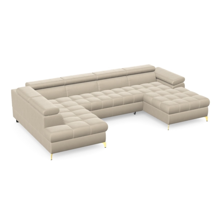 The Lugano III corner sofa by Pushman is an extended model with a width of 344 cm, a height of 77 cm (up to 94 cm with the headrests extended) and a depth of 174 cm on the shorter side and 202 cm on the longer side. The furniture offers a choice of metal legs - chrome or gold versions are available in the configurator, and in addition the model can also be ordered with black legs, which bring a more subdued touch to the arrangement. ( available as a separate product on our website).