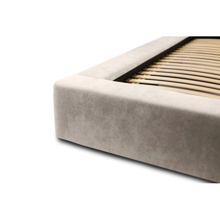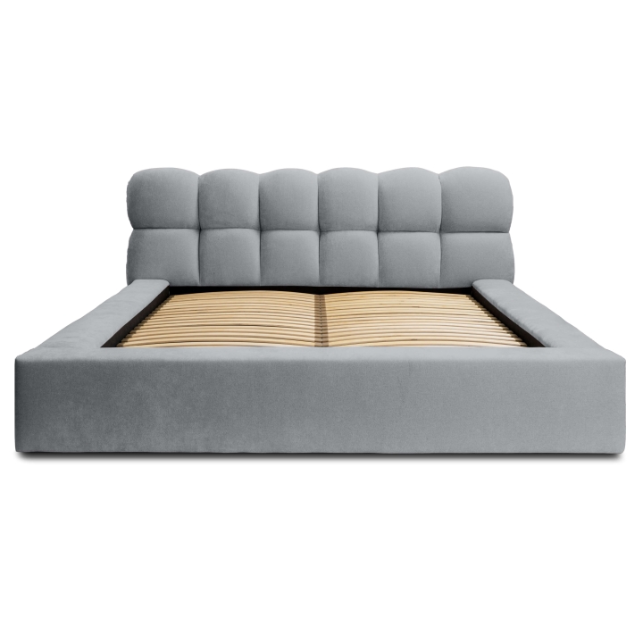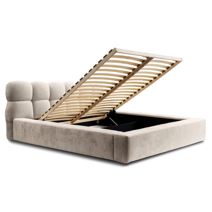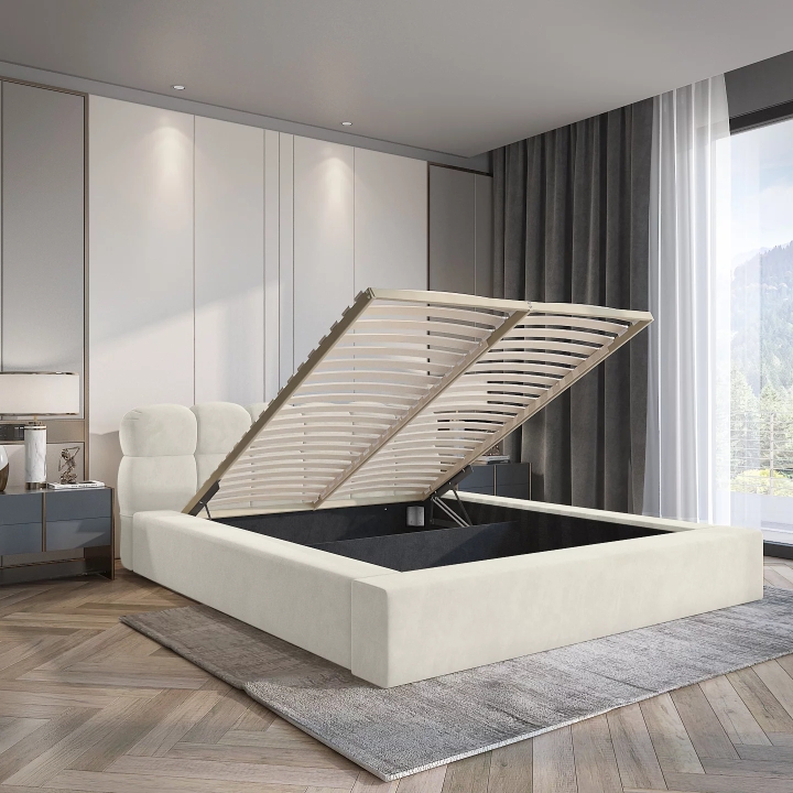 The standard version of the frame - with a wooden base with spring lifts - ensures free air circulation, protecting the mattress from moisture. Due to the wide range of mattresses available on the market, including spring-loaded models with higher weight, the manufacturer recommends the option of purchasing a metal frame with 1000 N gas lifts, available at a small additional cost. (selectable in the configurator) Such a frame is characterised by greater strength and the actuators effectively prevent the frame from sinking together with the mattress, even with heavy mattresses. This facilitates free access to the bedding container, which increases the convenience of daily use.