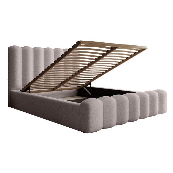 The standard version of the frame - with a wooden base and spring actuators - ensures free air circulation, protecting the mattress from moisture. Given the variety of mattresses available on the market, including the heavier spring models, the manufacturer recommends considering the purchase of a metal frame with 1000 N gas lifters, available at a small additional cost. Such a frame is characterised by increased durability, the actuators effectively prevent the frame from dropping even with heavy mattresses, and it facilitates access to the bedding container, which significantly increases the comfort of everyday use.
