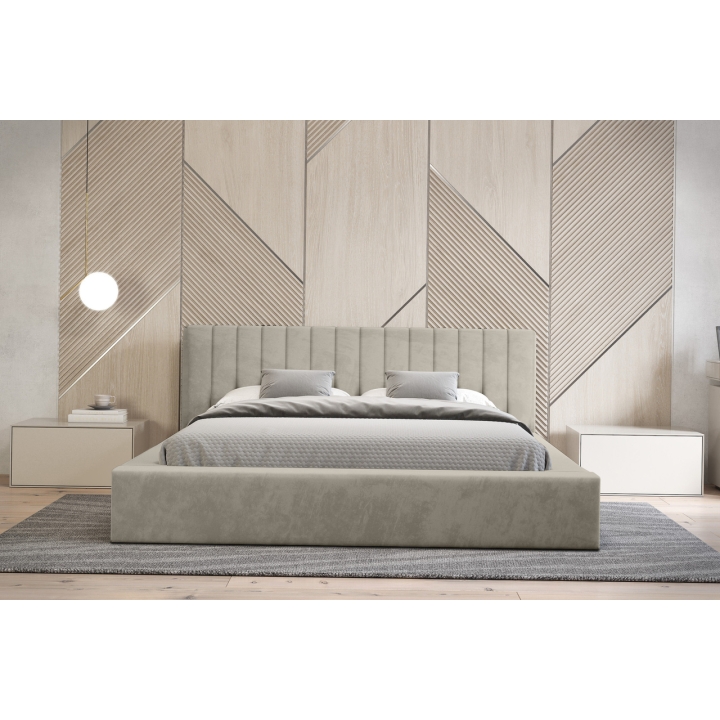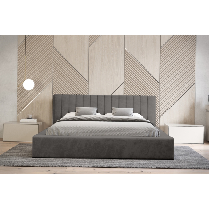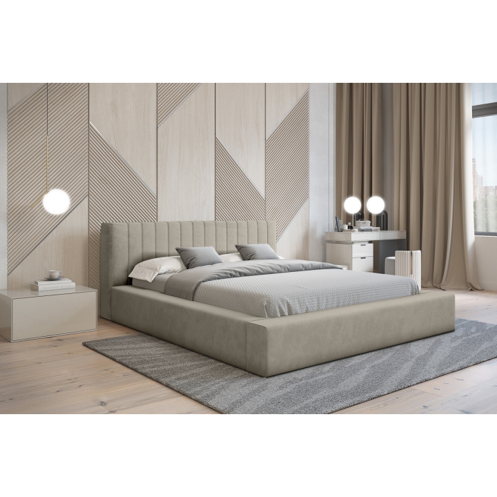 The COMO 160/200 upholstered bed with a container by the Quarto manufacturer, is distinguished by its unique construction, which delights with both its appearance and the solutions used. The generous bed frame, combined with the soft finish and stitching in vertical stripes, creates a space that encourages relaxation. The frame and headrest are covered with fabric.