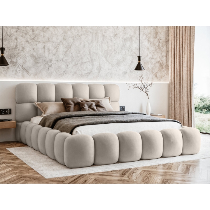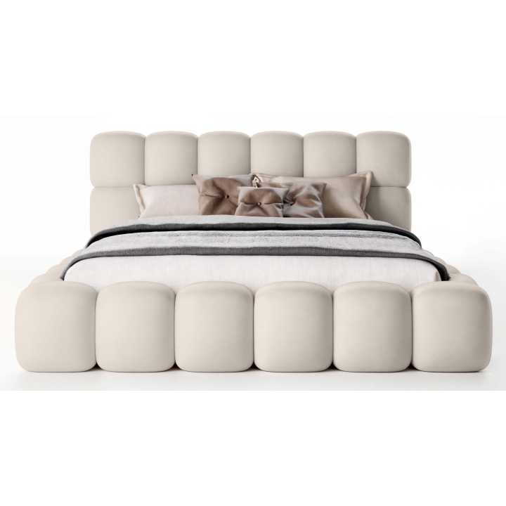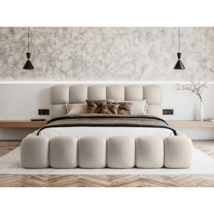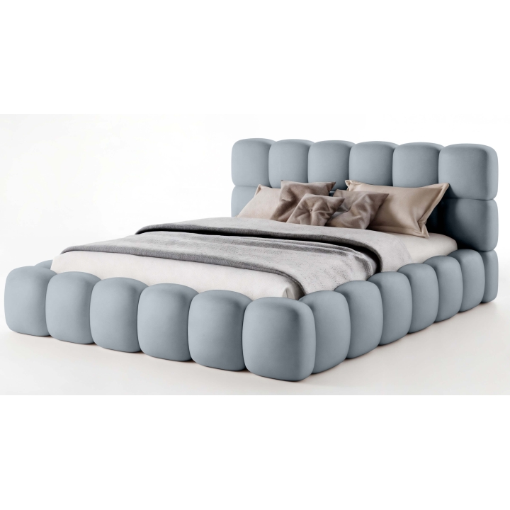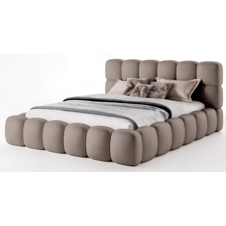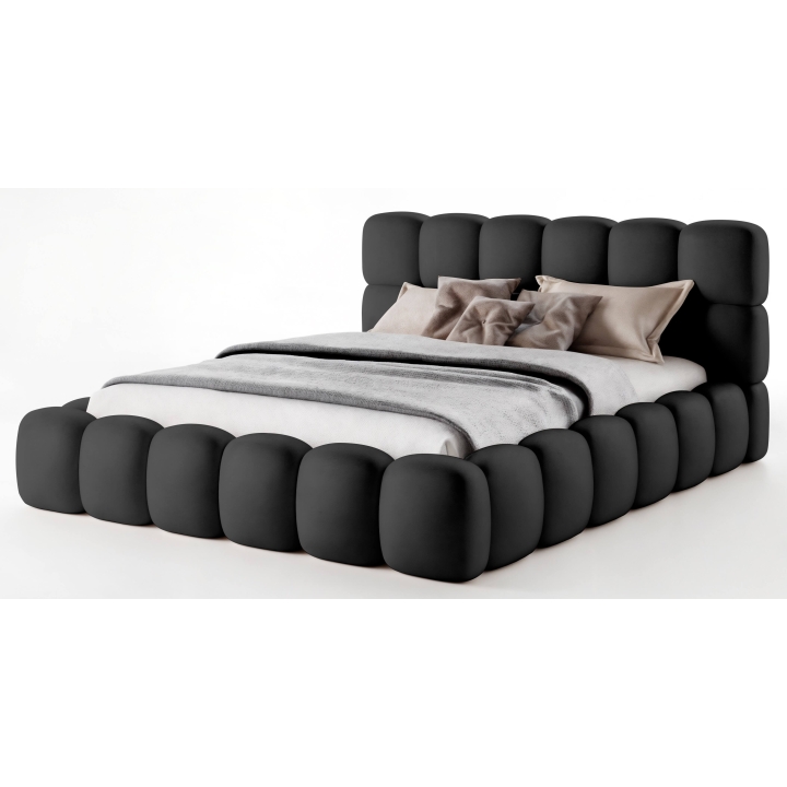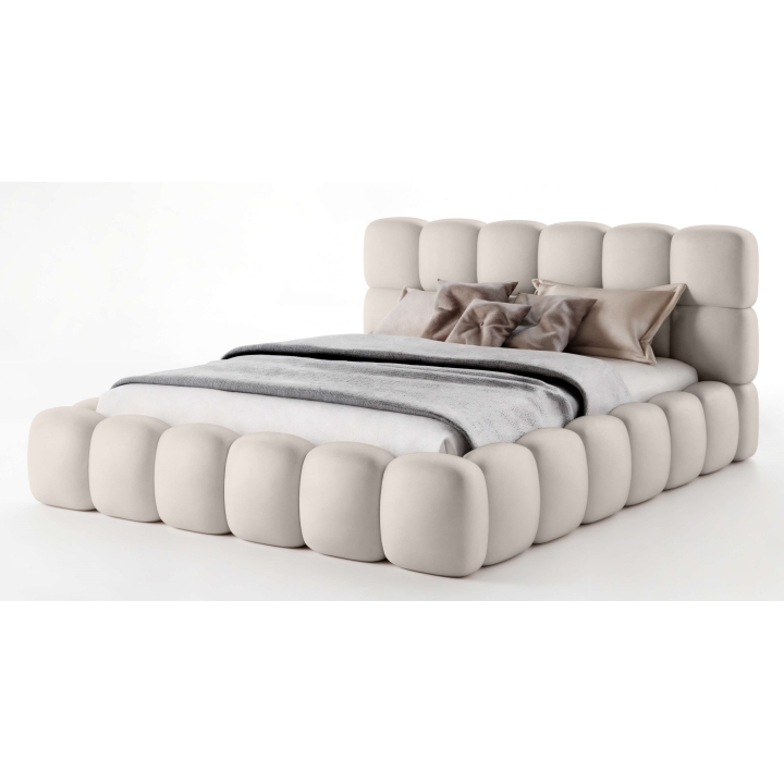 The Boston 160x200 upholstered bed with container from the manufacturer Quarto impresseswith a modern, unique design based on spherical forms that give it a distinctive character. The carefully crafted upholstery is available in a wide range of colours, allowing it to harmoniously match a variety of interior designs. The fluffy, soft headrest provides exceptional comfort when relaxing, while the rounded solids of the structure emphasise its unique style.