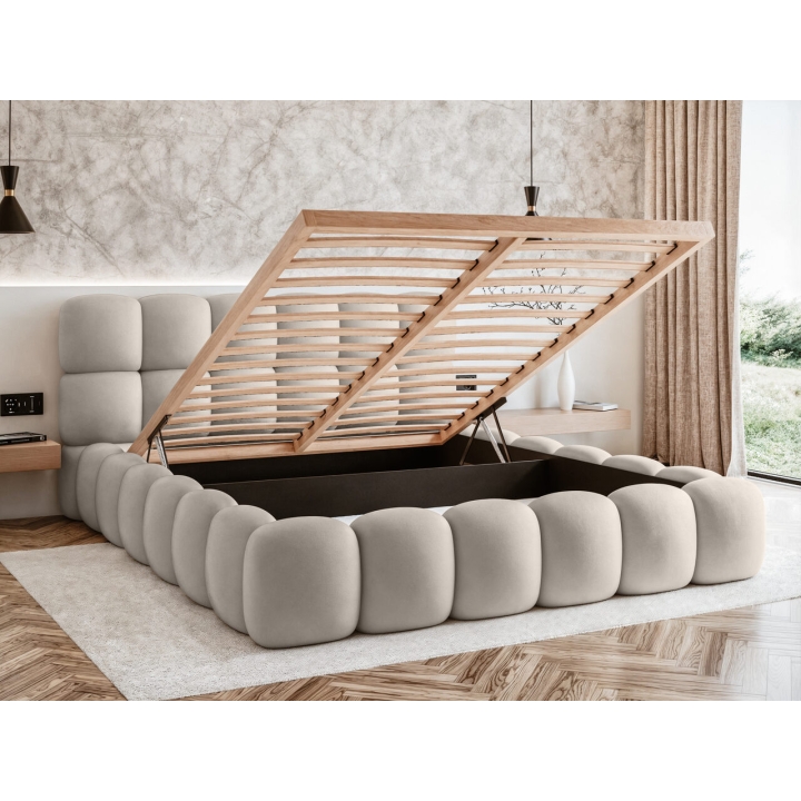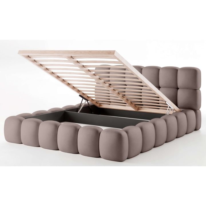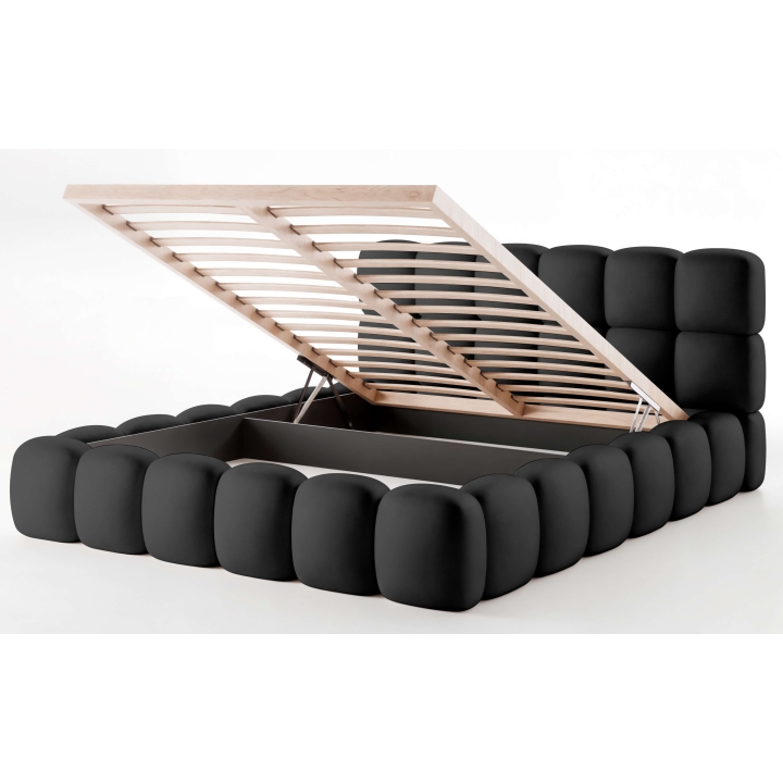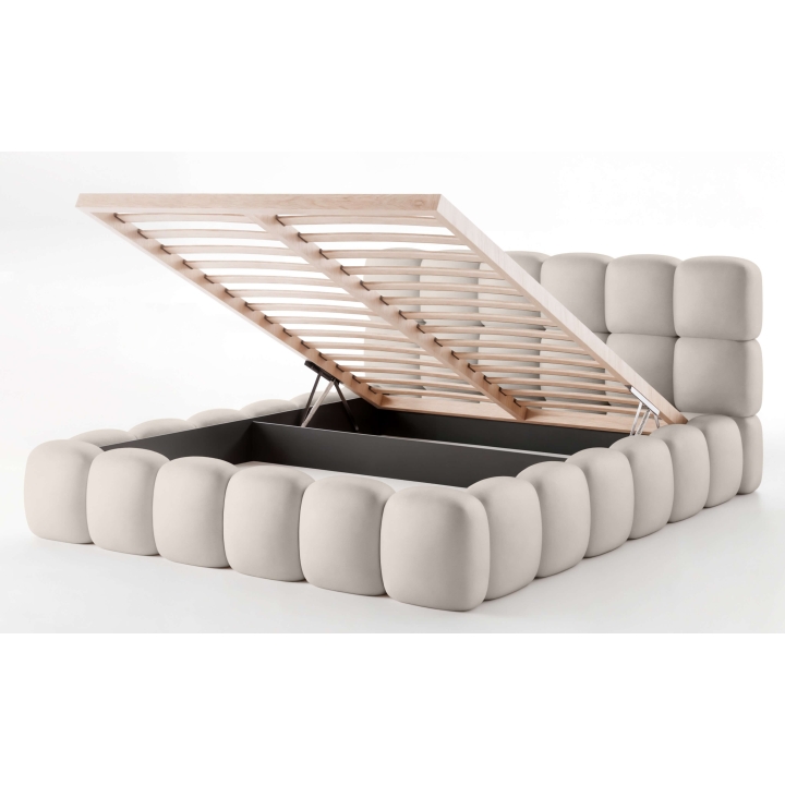 This model is equipped with a spacious bedding storage compartment, opening from the front, with a solid HDF bottom. The designer frame with an upholstered finish is distinguished by its original form, which will find its perfect place in modern bedrooms.