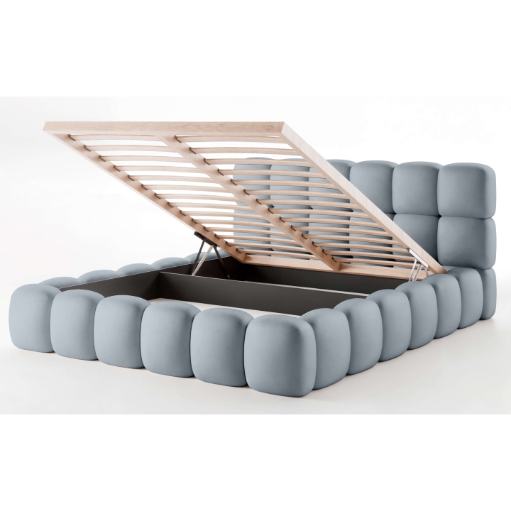 The standard version of the frame - with a wooden base and spring actuators - ensures free air circulation, protecting the mattress from moisture. Given the variety of mattresses available on the market, including the heavier spring models, the manufacturer recommends considering the purchase of a metal frame with 1000 N gas lifters, available at a small additional cost. (selection in the configurator) Such a frame is characterised by increased durability, the actuators effectively prevent the frame from dropping even in the case of heavy mattresses, it facilitates access to the bedding container, which significantly increases the comfort of everyday use.