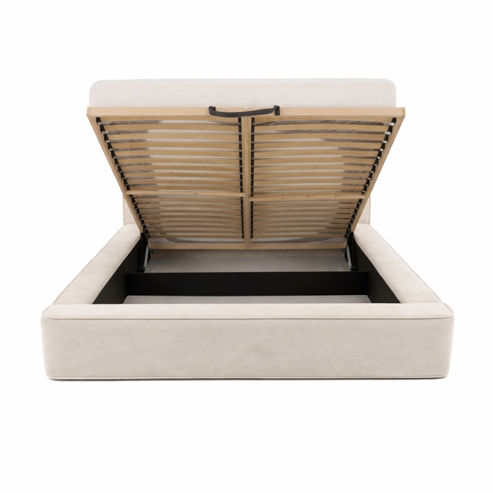 The mattress frame is designed with durability and comfort in mind. The standard version of the frame - with a wooden base and spring actuators - ensures free air circulation, protecting the mattress from moisture. Given the variety of mattresses available on the market, including the heavier spring models, the manufacturer recommends considering the purchase of a metal frame with 1000 N gas lifters, available at a small additional cost. Such a frame is characterised by increased strength, the actuators effectively prevent sinking of the frame even with heavy mattresses, it facilitates access to the bedding container, which significantly increases the comfort of everyday use.