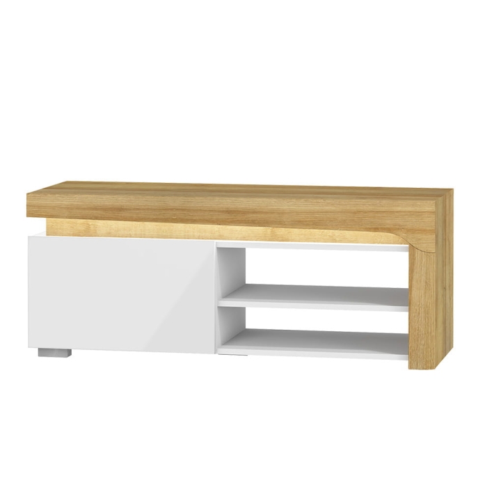 Riviera Oak paired with glossy white brings a light, modern look. Finger-pull recesses ensure easy opening without protruding handles. The stand can be enhanced with the optional NEO-8 warm-white LED strip installed in the top panel, adding a soft evening glow. Delivered in two packages for convenient transport and assembly.