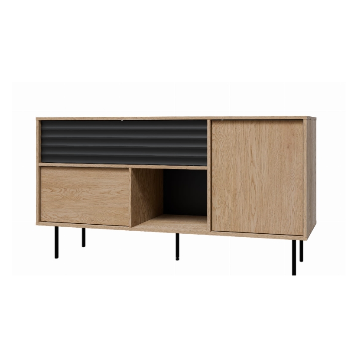The ARD-KO150 sideboard combines a closed front section with an open storage area, giving room for both display items and items you prefer to keep hidden. The body in Cremona Oak is made from matte laminated board, while the black matte front uses MDF with PVC foil and matching board elements. The unit stands on black legs that provide a stable, lightweight look.